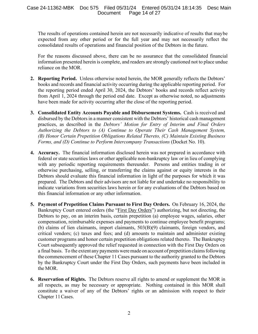 2 The results of operations contained herein are not necessarily indicative of results that may be expected from any other period or for the full year and may not necessarily reflect the consolidated results of operations and financial position of the Debtors in the future. For the reasons discussed above, there can be no assurance that the consolidated financial information presented herein is complete, and readers are strongly cautioned not to place undue reliance on the MOR. 2. Reporting Period. Unless otherwise noted herein, the MOR generally reflects the Debtors’ books and records and financial activity occurring during the applicable reporting period. For the reporting period ended April 30, 2024, the Debtors’ books and records reflect activity from April 1, 2024 through the period end date. Except as otherwise noted, no adjustments have been made for activity occurring after the close of the reporting period. 3. Consolidated Entity Accounts Payable and Disbursement Systems. Cash is received and disbursed by the Debtors in a manner consistent with the Debtors’ historical cash management practices, as described in the Debtors’ Motion for Entry of Interim and Final Orders Authorizing the Debtors to (A) Continue to Operate Their Cash Management System, (B) Honor Certain Prepetition Obligations Related Thereto, (C) Maintain Existing Business Forms, and (D) Continue to Perform Intercompany Transactions (Docket No. 10). 4. Accuracy. The financial information disclosed herein was not prepared in accordance with federal or state securities laws or other applicable non-bankruptcy law or in lieu of complying with any periodic reporting requirements thereunder. Persons and entities trading in or otherwise purchasing, selling, or transferring the claims against or equity interests in the Debtors should evaluate this financial information in light of the purposes for which it was prepared. The Debtors and their advisors are not liable for and undertake no responsibility to indicate variations from securities laws herein or for any evaluations of the Debtors based on this financial information or any other information. 5. Payment of Prepetition Claims Pursuant to First Day Orders. On February 16, 2024, the Bankruptcy Court entered orders (the “First Day Orders”) authorizing, but not directing, the Debtors to pay, on an interim basis, certain prepetition (a) employee wages, salaries, other compensation, reimbursable expenses and payments to continue employee benefit programs; (b) claims of lien claimants, import claimants, 503(B)(9) claimants, foreign vendors, and critical vendors; (c) taxes and fees; and (d) amounts to maintain and administer existing customer programs and honor certain prepetition obligations related thereto. The Bankruptcy Court subsequently approved the relief requested in connection with the First Day Orders on a final basis. To the extent any payments were made on account of prepetition claims following the commencement of these Chapter 11 Cases pursuant to the authority granted to the Debtors by the Bankruptcy Court under the First Day Orders, such payments have been included in the MOR. 6. Reservation of Rights. The Debtors reserve all rights to amend or supplement the MOR in all respects, as may be necessary or appropriate. Nothing contained in this MOR shall constitute a waiver of any of the Debtors’ rights or an admission with respect to their Chapter 11 Cases. Case 24-11362-MBK Doc 575 Filed 05/31/24 Entered 05/31/24 18:14:35 Desc Main Document Page 14 of 27