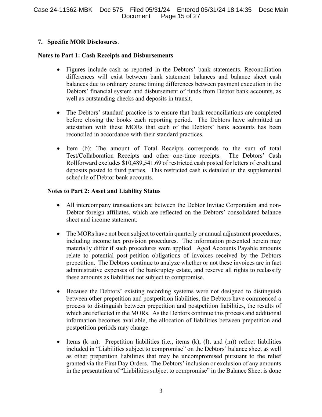 3 7. Specific MOR Disclosures. Notes to Part 1: Cash Receipts and Disbursements • Figures include cash as reported in the Debtors’ bank statements. Reconciliation differences will exist between bank statement balances and balance sheet cash balances due to ordinary course timing differences between payment execution in the Debtors’ financial system and disbursement of funds from Debtor bank accounts, as well as outstanding checks and deposits in transit. • The Debtors’ standard practice is to ensure that bank reconciliations are completed before closing the books each reporting period. The Debtors have submitted an attestation with these MORs that each of the Debtors’ bank accounts has been reconciled in accordance with their standard practices. • Item (b): The amount of Total Receipts corresponds to the sum of total Test/Collaboration Receipts and other one-time receipts. The Debtors’ Cash Rollforward excludes $10,489,541.69 of restricted cash posted for letters of credit and deposits posted to third parties. This restricted cash is detailed in the supplemental schedule of Debtor bank accounts. Notes to Part 2: Asset and Liability Status • All intercompany transactions are between the Debtor Invitae Corporation and non- Debtor foreign affiliates, which are reflected on the Debtors’ consolidated balance sheet and income statement. • The MORs have not been subject to certain quarterly or annual adjustment procedures, including income tax provision procedures. The information presented herein may materially differ if such procedures were applied. Aged Accounts Payable amounts relate to potential post-petition obligations of invoices received by the Debtors prepetition. The Debtors continue to analyze whether or not these invoices are in fact administrative expenses of the bankruptcy estate, and reserve all rights to reclassify these amounts as liabilities not subject to compromise. • Because the Debtors’ existing recording systems were not designed to distinguish between other prepetition and postpetition liabilities, the Debtors have commenced a process to distinguish between prepetition and postpetition liabilities, the results of which are reflected in the MORs. As the Debtors continue this process and additional information becomes available, the allocation of liabilities between prepetition and postpetition periods may change. • Items (k–m): Prepetition liabilities (i.e., items (k), (l), and (m)) reflect liabilities included in “Liabilities subject to compromise” on the Debtors’ balance sheet as well as other prepetition liabilities that may be uncompromised pursuant to the relief granted via the First Day Orders. The Debtors’ inclusion or exclusion of any amounts in the presentation of “Liabilities subject to compromise” in the Balance Sheet is done Case 24-11362-MBK Doc 575 Filed 05/31/24 Entered 05/31/24 18:14:35 Desc Main Document Page 15 of 27