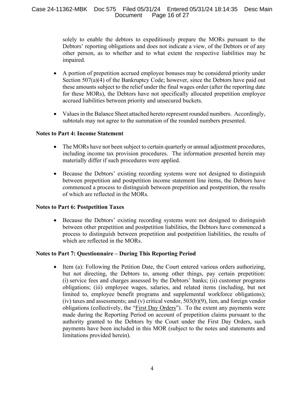 4 solely to enable the debtors to expeditiously prepare the MORs pursuant to the Debtors’ reporting obligations and does not indicate a view, of the Debtors or of any other person, as to whether and to what extent the respective liabilities may be impaired. • A portion of prepetition accrued employee bonuses may be considered priority under Section 507(a)(4) of the Bankruptcy Code; however, since the Debtors have paid out these amounts subject to the relief under the final wages order (after the reporting date for these MORs), the Debtors have not specifically allocated prepetition employee accrued liabilities between priority and unsecured buckets. • Values in the Balance Sheet attached hereto represent rounded numbers. Accordingly, subtotals may not agree to the summation of the rounded numbers presented. Notes to Part 4: Income Statement • The MORs have not been subject to certain quarterly or annual adjustment procedures, including income tax provision procedures. The information presented herein may materially differ if such procedures were applied. • Because the Debtors’ existing recording systems were not designed to distinguish between prepetition and postpetition income statement line items, the Debtors have commenced a process to distinguish between prepetition and postpetition, the results of which are reflected in the MORs. Notes to Part 6: Postpetition Taxes • Because the Debtors’ existing recording systems were not designed to distinguish between other prepetition and postpetition liabilities, the Debtors have commenced a process to distinguish between prepetition and postpetition liabilities, the results of which are reflected in the MORs. Notes to Part 7: Questionnaire – During This Reporting Period • Item (a): Following the Petition Date, the Court entered various orders authorizing, but not directing, the Debtors to, among other things, pay certain prepetition: (i) service fees and charges assessed by the Debtors’ banks; (ii) customer programs obligations; (iii) employee wages, salaries, and related items (including, but not limited to, employee benefit programs and supplemental workforce obligations); (iv) taxes and assessments; and (v) critical vendor, 503(b)(9), lien, and foreign vendor obligations (collectively, the “First Day Orders”). To the extent any payments were made during the Reporting Period on account of prepetition claims pursuant to the authority granted to the Debtors by the Court under the First Day Orders, such payments have been included in this MOR (subject to the notes and statements and limitations provided herein). Case 24-11362-MBK Doc 575 Filed 05/31/24 Entered 05/31/24 18:14:35 Desc Main Document Page 16 of 27