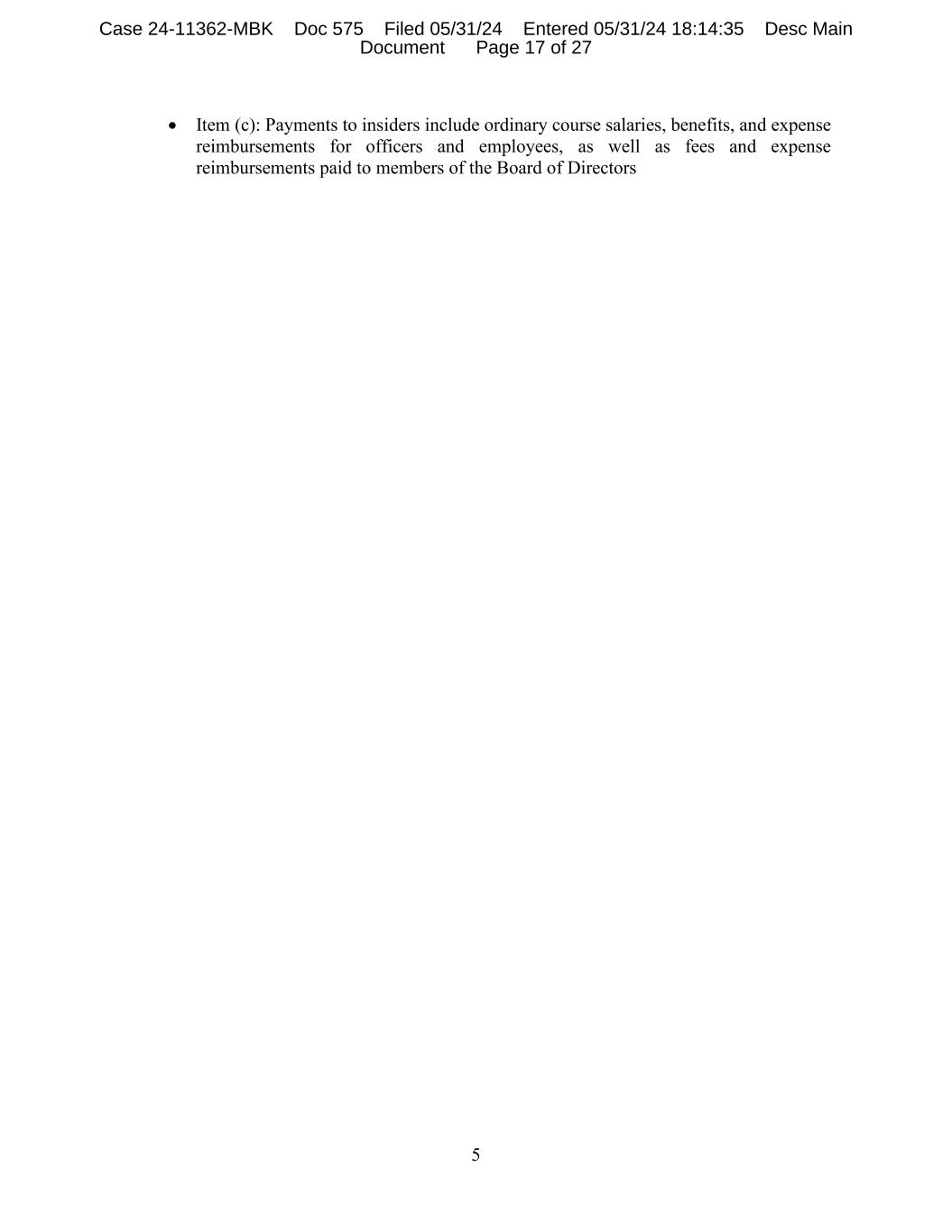 5 • Item (c): Payments to insiders include ordinary course salaries, benefits, and expense reimbursements for officers and employees, as well as fees and expense reimbursements paid to members of the Board of Directors Case 24-11362-MBK Doc 575 Filed 05/31/24 Entered 05/31/24 18:14:35 Desc Main Document Page 17 of 27