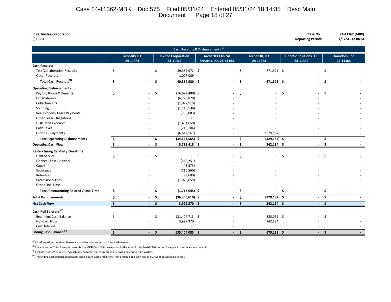 In re: Invitae Corporation Case No.: 24-11362 (MBK) ($ USD) Reporting Period: 4/1/24 - 4/30/24 Cash Receipts & Disbursements(1) Genosity LLC 24-11361 Invitae Corporation 24-11362 ArcherDX Clinical Services, Inc. 24-11363 ArcherDX, LLC 24-11364 Genetic Solutions LLC 24-11365 Ommdom, Inc. 24-11366 Cash Receipts Test/Collaboration Receipts -$ 39,352,972$ -$ 671,321$ -$ -$ Other Receipts - 1,007,009 - - - - Total Cash Receipts(2) -$ 40,359,980$ -$ 671,321$ -$ -$ Operating Disbursements Payroll, Bonus & Benefits -$ (16,622,480)$ -$ -$ -$ -$ Lab Materials - (6,773,829) - - - - Collection Kits - (1,077,515) - - - - Shipping - (1,118,536) - - - - Real Property Lease Payments - (783,883) - - - - Other Lease Obligations - - - - - - IT-Related Expenses - (1,431,659) - - - - Cash Taxes - (218,104) - - - - Other AP Payments - (6,617,561) - (329,187) - - Total Operating Disbursements -$ (34,643,565)$ -$ (329,187)$ -$ -$ Operating Cash Flow -$ 5,716,415$ -$ 342,134$ -$ -$ Restructuring Related / One-Time Debt Service -$ -$ -$ -$ -$ -$ Finance Lease Principal - (446,251) - - - - Capex - (43,575) - - - - Severance - (110,560) - - - - Retention - (93,600) - - - - Professional Fees - (1,023,059) - - - - Other One-Time - - - - - - Total Restructuring Related / One-Time -$ (1,717,045)$ -$ -$ -$ -$ Total Disbursements -$ (36,360,610)$ -$ (329,187)$ -$ -$ Net Cash Flow -$ 3,999,370$ -$ 342,134$ -$ -$ Cash Roll Forward (3) Beginning Cash Balance -$ 131,404,713$ -$ 333,055 -$ -$ Net Cash Flow - 3,999,370 - 342,134 - - Cash Interest - - - - - - Ending Cash Balance (4) -$ 135,404,083$ -$ 675,189$ -$ -$ (1) All information contained herein is unaudited and subject to future adjustment. (2) The amount of Total Receipts presented in MOR Part 1(b) corresponds to the sum of total Test/Collaboration Receipts + other one-time receipts. (3) Excludes $10.5M of restricted cash posted for letters of credit and deposits posted to third parties. (4) The ending cash balance represents ending bank cash and differs from ending book cash due to $0.4M of outstanding checks. Case 24-11362-MBK Doc 575 Filed 05/31/24 Entered 05/31/24 18:14:35 Desc Main Document Page 18 of 27