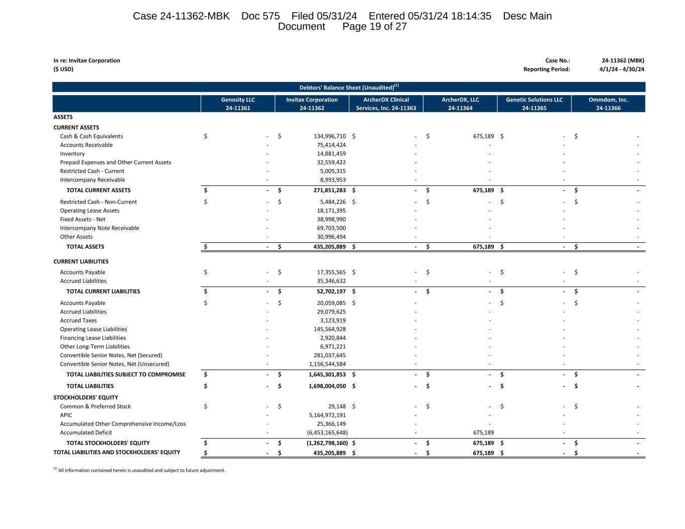 In re: Invitae Corporation Case No.: 24-11362 (MBK) ($ USD) Reporting Period: 4/1/24 - 4/30/24 Debtors' Balance Sheet (Unaudited)(1) Genosity LLC 24-11361 Invitae Corporation 24-11362 ArcherDX Clinical Services, Inc. 24-11363 ArcherDX, LLC 24-11364 Genetic Solutions LLC 24-11365 Ommdom, Inc. 24-11366 ASSETS CURRENT ASSETS Cash & Cash Equivalents -$ 134,996,710$ -$ 675,189$ -$ -$ Accounts Receivable - 75,414,424 - - - - Inventory - 14,881,459 - - - - Prepaid Expenses and Other Current Assets - 32,559,422 - - - - Restricted Cash - Current - 5,005,315 - - - - Intercompany Receivable - 8,993,953 - - - - TOTAL CURRENT ASSETS -$ 271,851,283$ -$ 675,189$ -$ -$ Restricted Cash - Non-Current -$ 5,484,226$ -$ -$ -$ -$ Operating Lease Assets - 18,171,395 - - - - Fixed Assets - Net - 38,998,990 - - - - Intercompany Note Receivable - 69,703,500 - - - - Other Assets - 30,996,494 - - - - TOTAL ASSETS -$ 435,205,889$ -$ 675,189$ -$ -$ CURRENT LIABILITIES Accounts Payable -$ 17,355,565$ -$ -$ -$ -$ Accrued Liabilities - 35,346,632 - - - - TOTAL CURRENT LIABILITIES -$ 52,702,197$ -$ -$ -$ -$ Accounts Payable -$ 20,059,085$ -$ - -$ -$ Accrued Liabilities - 29,079,625 - - - - Accrued Taxes - 3,123,919 - - - - Operating Lease Liabilities - 145,564,928 - - - - Financing Lease Liabilities - 2,920,844 - - - - Other Long-Term Liabilities - 6,971,221 - - - - Convertible Senior Notes, Net (Secured) - 281,037,645 - - - - Convertible Senior Notes, Net (Unsecured) - 1,156,544,584 - - - - TOTAL LIABILITIES SUBJECT TO COMPROMISE -$ 1,645,301,853$ -$ -$ -$ -$ TOTAL LIABILITIES -$ 1,698,004,050$ -$ -$ -$ -$ STOCKHOLDERS' EQUITY Common & Preferred Stock -$ 29,148$ -$ -$ -$ -$ APIC - 5,164,972,191 - - - - Accumulated Other Comprehensive Income/Loss - 25,366,149 - - - - Accumulated Deficit - (6,453,165,648) - 675,189 - - TOTAL STOCKHOLDERS' EQUITY -$ (1,262,798,160)$ -$ 675,189$ -$ -$ TOTAL LIABILITIES AND STOCKHOLDERS' EQUITY -$ 435,205,889$ -$ 675,189$ -$ -$ (1) All information contained herein is unaudited and subject to future adjustment. Case 24-11362-MBK Doc 575 Filed 05/31/24 Entered 05/31/24 18:14:35 Desc Main Document Page 19 of 27