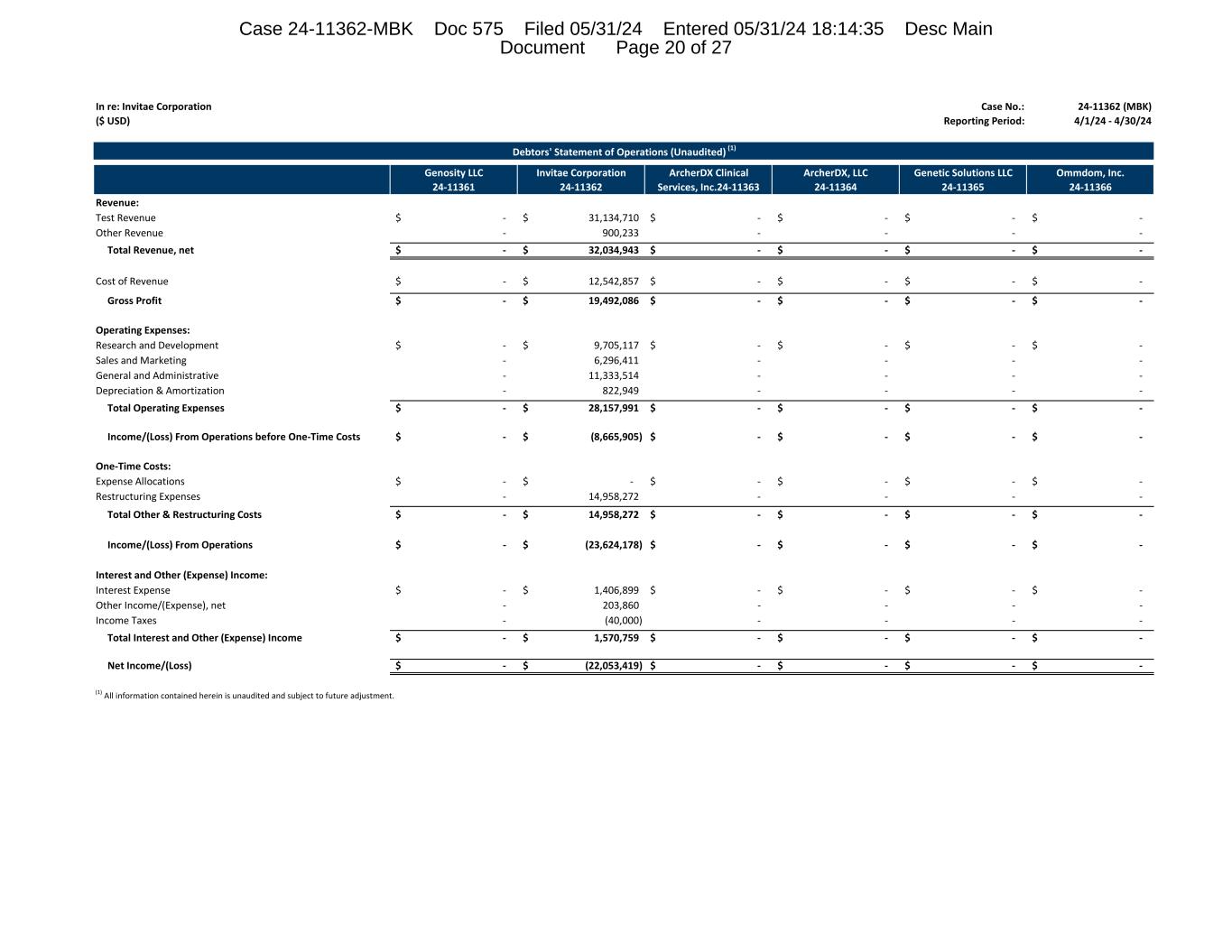 In re: Invitae Corporation Case No.: 24-11362 (MBK) ($ USD) Reporting Period: 4/1/24 - 4/30/24 Debtors' Statement of Operations (Unaudited) (1) Genosity LLC 24-11361 Invitae Corporation 24-11362 ArcherDX Clinical Services, Inc.24-11363 ArcherDX, LLC 24-11364 Genetic Solutions LLC 24-11365 Ommdom, Inc. 24-11366 Revenue: Test Revenue -$ 31,134,710$ -$ -$ -$ -$ Other Revenue - 900,233 - - - - Total Revenue, net -$ 32,034,943$ -$ -$ -$ -$ Cost of Revenue -$ 12,542,857$ -$ -$ -$ -$ Gross Profit -$ 19,492,086$ -$ -$ -$ -$ Operating Expenses: Research and Development -$ 9,705,117$ -$ -$ -$ -$ Sales and Marketing - 6,296,411 - - - - General and Administrative - 11,333,514 - - - - Depreciation & Amortization - 822,949 - - - - Total Operating Expenses -$ 28,157,991$ -$ -$ -$ -$ Income/(Loss) From Operations before One-Time Costs -$ (8,665,905)$ -$ -$ -$ -$ One-Time Costs: Expense Allocations -$ -$ -$ -$ -$ -$ Restructuring Expenses - 14,958,272 - - - - Total Other & Restructuring Costs -$ 14,958,272$ -$ -$ -$ -$ Income/(Loss) From Operations -$ (23,624,178)$ -$ -$ -$ -$ Interest and Other (Expense) Income: Interest Expense -$ 1,406,899$ -$ -$ -$ -$ Other Income/(Expense), net - 203,860 - - - - Income Taxes - (40,000) - - - - Total Interest and Other (Expense) Income -$ 1,570,759$ -$ -$ -$ -$ Net Income/(Loss) -$ (22,053,419)$ -$ -$ -$ -$ (1) All information contained herein is unaudited and subject to future adjustment. Case 24-11362-MBK Doc 575 Filed 05/31/24 Entered 05/31/24 18:14:35 Desc Main Document Page 20 of 27