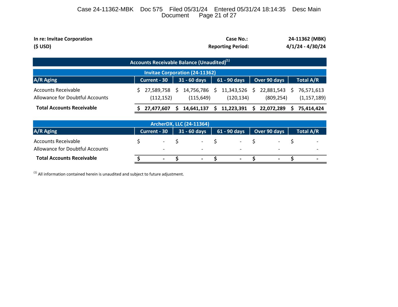 In re: Invitae Corporation Case No.: 24-11362 (MBK) ($ USD) Reporting Period: 4/1/24 - 4/30/24 Accounts Receivable Balance (Unaudited)(1) Invitae Corporation (24-11362) A/R Aging Current - 30 31 - 60 days 61 - 90 days Over 90 days Total A/R Accounts Receivable 27,589,758$ 14,756,786$ 11,343,526$ 22,881,543$ 76,571,613$ Allowance for Doubtful Accounts (112,152) (115,649) (120,134) (809,254) (1,157,189) Total Accounts Receivable 27,477,607$ 14,641,137$ 11,223,391$ 22,072,289$ 75,414,424$ ArcherDX, LLC (24-11364) A/R Aging Current - 30 31 - 60 days 61 - 90 days Over 90 days Total A/R Accounts Receivable -$ -$ -$ -$ -$ Allowance for Doubtful Accounts - - - - - Total Accounts Receivable -$ -$ -$ -$ -$ (1) All information contained herein is unaudited and subject to future adjustment. Case 24-11362-MBK Doc 575 Filed 05/31/24 Entered 05/31/24 18:14:35 Desc Main Document Page 21 of 27