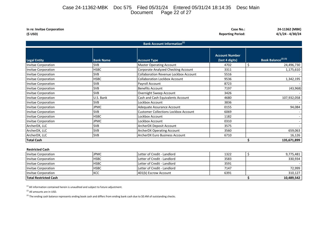 In re: Invitae Corporation Case No.: 24-11362 (MBK) ($ USD) Reporting Period: 4/1/24 - 4/30/24 Bank Account Information(1) Legal Entity Bank Name Account Type Account Number (last 4 digits) Book Balance(2) (3) Invitae Corporation SVB Master Operating Account 4702 24,496,730$ Invitae Corporation HSBC Corporate Analyzed Checking Account 3311 1,175,610 Invitae Corporation SVB Collaboration Revenue Lockbox Account 5516 - Invitae Corporation HSBC Collaboration Lockbox Account 9536 1,342,195 Invitae Corporation SVB Payroll Account 8723 - Invitae Corporation SVB Benefits Account 7197 (43,968) Invitae Corporation SVB Overnight Sweep Account 3426 - Invitae Corporation U.S. Bank Cash and Cash Equivalents Account 4680 107,932,058 Invitae Corporation SVB Lockbox Account 3836 - Invitae Corporation JPMC Adequate Assurance Account 0155 94,084 Invitae Corporation SVB Customer Collections Lockbox Account 6069 - Invitae Corporation HSBC Lockbox Account 1182 - Invitae Corporation JPMC Lockbox Account 0310 - ArcherDX, LLC SVB ArcherDX Deposit Account 3575 - ArcherDX, LLC SVB ArcherDX Operating Account 3560 659,063 ArcherDX, LLC SVB ArcherDX Euro Business Account 6710 16,126 Total Cash 135,671,899$ Restricted Cash Invitae Corporation JPMC Letter of Credit - Landlord 1322 9,775,481$ Invitae Corporation HSBC Letter of Credit - Landlord 3583 330,934 Invitae Corporation HSBC Letter of Credit - Landlord 3591 - Invitae Corporation HSBC Letter of Credit - Landlord 7147 72,999 Invitae Corporation KCC 401(k) Escrow Account 6391 310,127 Total Restricted Cash 10,489,542$ (1) All information contained herein is unaudited and subject to future adjustment. (2) All amounts are in USD. (3) The ending cash balance represents ending book cash and differs from ending bank cash due to $0.4M of outstanding checks. Case 24-11362-MBK Doc 575 Filed 05/31/24 Entered 05/31/24 18:14:35 Desc Main Document Page 22 of 27