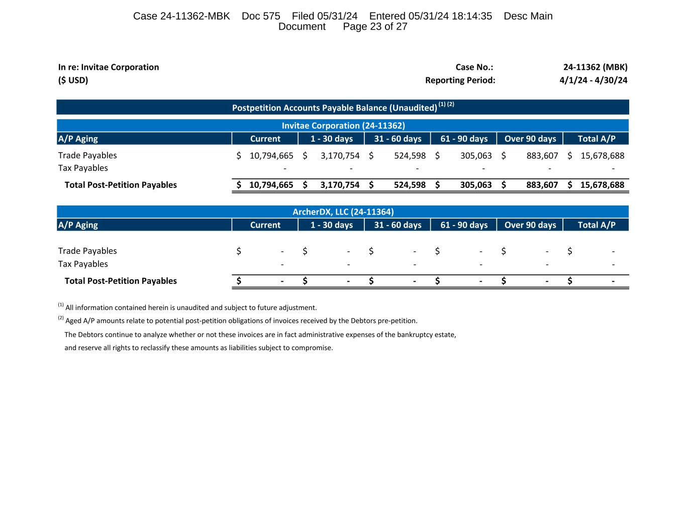 In re: Invitae Corporation Case No.: 24-11362 (MBK) ($ USD) Reporting Period: 4/1/24 - 4/30/24 Postpetition Accounts Payable Balance (Unaudited) (1) (2) Invitae Corporation (24-11362) A/P Aging Current 1 - 30 days 31 - 60 days 61 - 90 days Over 90 days Total A/P Trade Payables 10,794,665$ 3,170,754$ 524,598$ 305,063$ 883,607$ 15,678,688$ Tax Payables - - - - - - Total Post-Petition Payables 10,794,665$ 3,170,754$ 524,598$ 305,063$ 883,607$ 15,678,688$ ArcherDX, LLC (24-11364) A/P Aging Current 1 - 30 days 31 - 60 days 61 - 90 days Over 90 days Total A/P Trade Payables -$ -$ -$ -$ -$ -$ Tax Payables - - - - - - Total Post-Petition Payables -$ -$ -$ -$ -$ -$ (1) All information contained herein is unaudited and subject to future adjustment. (2) Aged A/P amounts relate to potential post-petition obligations of invoices received by the Debtors pre-petition. The Debtors continue to analyze whether or not these invoices are in fact administrative expenses of the bankruptcy estate, and reserve all rights to reclassify these amounts as liabilities subject to compromise. Case 24-11362-MBK Doc 575 Filed 05/31/24 Entered 05/31/24 18:14:35 Desc Main Document Page 23 of 27