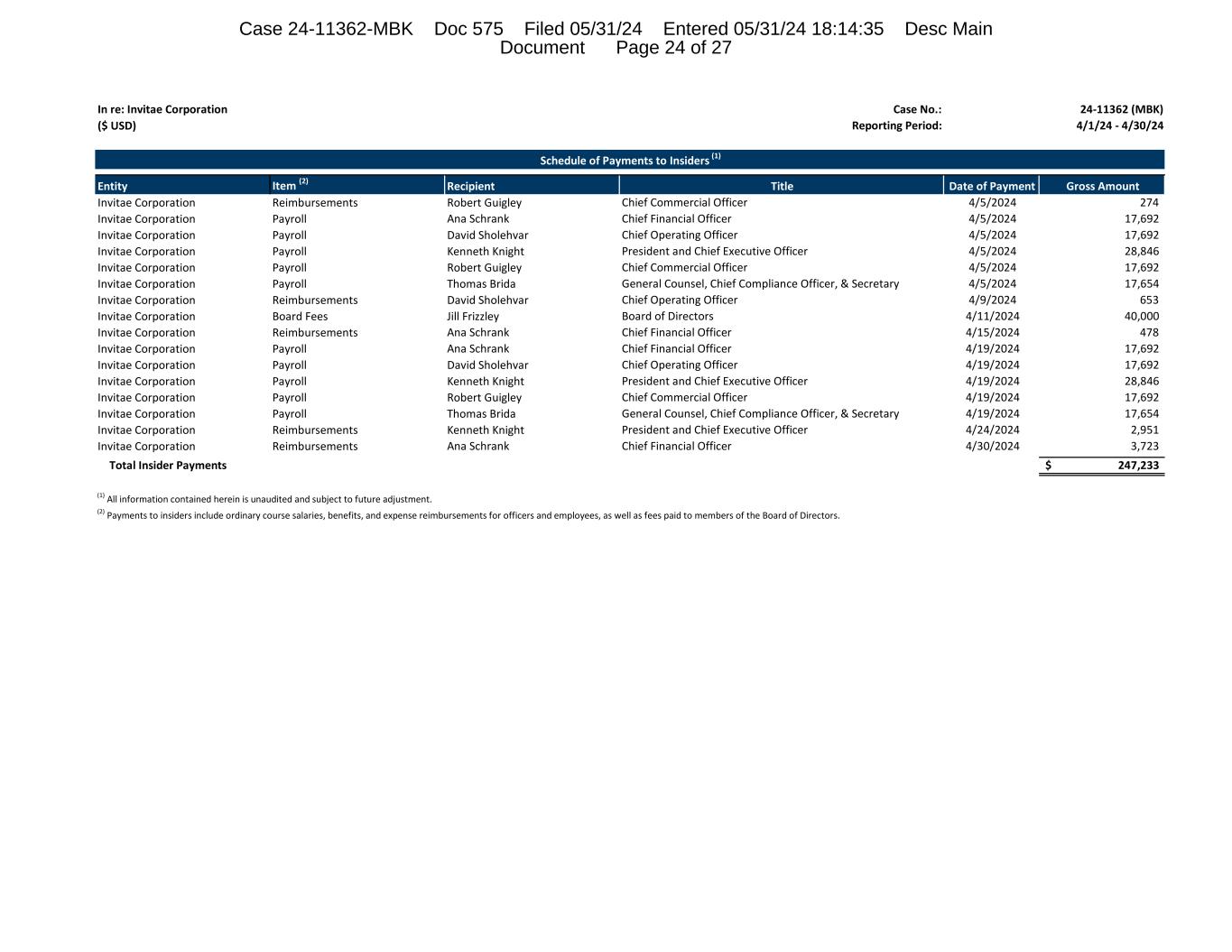 In re: Invitae Corporation Case No.: 24-11362 (MBK) ($ USD) Reporting Period: 4/1/24 - 4/30/24 Schedule of Payments to Insiders (1) Entity Item (2) Recipient Title Date of Payment Gross Amount Invitae Corporation Reimbursements Robert Guigley Chief Commercial Officer 4/5/2024 274 Invitae Corporation Payroll Ana Schrank Chief Financial Officer 4/5/2024 17,692 Invitae Corporation Payroll David Sholehvar Chief Operating Officer 4/5/2024 17,692 Invitae Corporation Payroll Kenneth Knight President and Chief Executive Officer 4/5/2024 28,846 Invitae Corporation Payroll Robert Guigley Chief Commercial Officer 4/5/2024 17,692 Invitae Corporation Payroll Thomas Brida General Counsel, Chief Compliance Officer, & Secretary 4/5/2024 17,654 Invitae Corporation Reimbursements David Sholehvar Chief Operating Officer 4/9/2024 653 Invitae Corporation Board Fees Jill Frizzley Board of Directors 4/11/2024 40,000 Invitae Corporation Reimbursements Ana Schrank Chief Financial Officer 4/15/2024 478 Invitae Corporation Payroll Ana Schrank Chief Financial Officer 4/19/2024 17,692 Invitae Corporation Payroll David Sholehvar Chief Operating Officer 4/19/2024 17,692 Invitae Corporation Payroll Kenneth Knight President and Chief Executive Officer 4/19/2024 28,846 Invitae Corporation Payroll Robert Guigley Chief Commercial Officer 4/19/2024 17,692 Invitae Corporation Payroll Thomas Brida General Counsel, Chief Compliance Officer, & Secretary 4/19/2024 17,654 Invitae Corporation Reimbursements Kenneth Knight President and Chief Executive Officer 4/24/2024 2,951 Invitae Corporation Reimbursements Ana Schrank Chief Financial Officer 4/30/2024 3,723 Total Insider Payments 247,233$ (1) All information contained herein is unaudited and subject to future adjustment. (2) Payments to insiders include ordinary course salaries, benefits, and expense reimbursements for officers and employees, as well as fees paid to members of the Board of Directors. Case 24-11362-MBK Doc 575 Filed 05/31/24 Entered 05/31/24 18:14:35 Desc Main Document Page 24 of 27