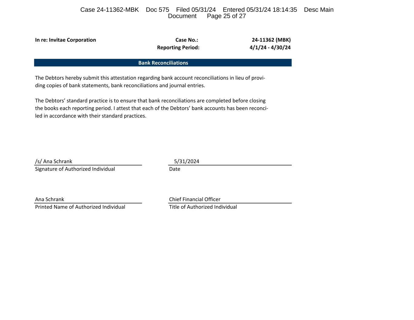 In re: Invitae Corporation Case No.: 24-11362 (MBK) Reporting Period: 4/1/24 - 4/30/24 Bank Reconciliations The Debtors hereby submit this attestation regarding bank account reconciliations in lieu of provi- ding copies of bank statements, bank reconciliations and journal entries. The Debtors’ standard practice is to ensure that bank reconciliations are completed before closing the books each reporting period. I attest that each of the Debtors’ bank accounts has been reconci- led in accordance with their standard practices. /s/ Ana Schrank 5/31/2024 Signature of Authorized Individual Date Ana Schrank Chief Financial Officer Printed Name of Authorized Individual Title of Authorized Individual Case 24-11362-MBK Doc 575 Filed 05/31/24 Entered 05/31/24 18:14:35 Desc Main Document Page 25 of 27