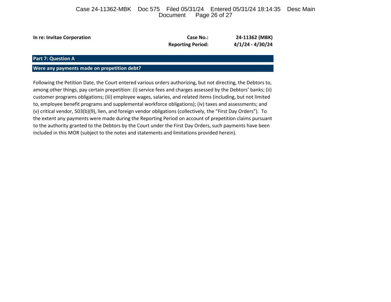 In re: Invitae Corporation Case No.: 24-11362 (MBK) Reporting Period: 4/1/24 - 4/30/24 Part 7: Question A Were any payments made on prepetition debt? Following the Petition Date, the Court entered various orders authorizing, but not directing, the Debtors to, among other things, pay certain prepetition: (i) service fees and charges assessed by the Debtors’ banks; (ii) customer programs obligations; (iii) employee wages, salaries, and related items (including, but not limited to, employee benefit programs and supplemental workforce obligations); (iv) taxes and assessments; and (v) critical vendor, 503(b)(9), lien, and foreign vendor obligations (collectively, the “First Day Orders”). To the extent any payments were made during the Reporting Period on account of prepetition claims pursuant to the authority granted to the Debtors by the Court under the First Day Orders, such payments have been included in this MOR (subject to the notes and statements and limitations provided herein). Case 24-11362-MBK Doc 575 Filed 05/31/24 Entered 05/31/24 18:14:35 Desc Main Document Page 26 of 27