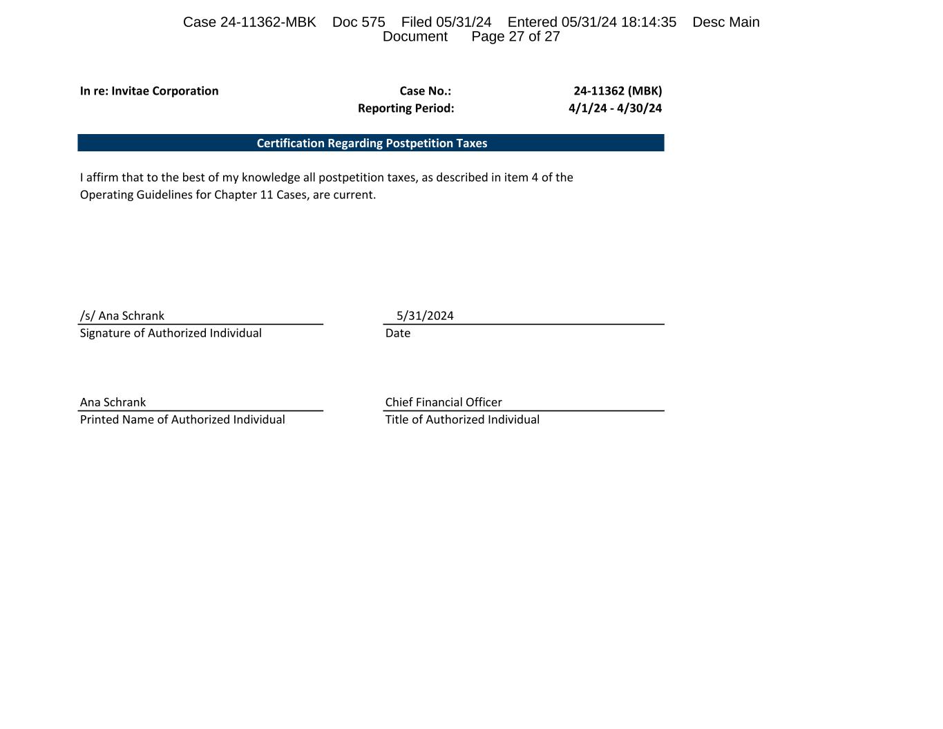 In re: Invitae Corporation Case No.: 24-11362 (MBK) Reporting Period: 4/1/24 - 4/30/24 Certification Regarding Postpetition Taxes I affirm that to the best of my knowledge all postpetition taxes, as described in item 4 of the Operating Guidelines for Chapter 11 Cases, are current. /s/ Ana Schrank 5/31/2024 Signature of Authorized Individual Date Ana Schrank Chief Financial Officer Printed Name of Authorized Individual Title of Authorized Individual Case 24-11362-MBK Doc 575 Filed 05/31/24 Entered 05/31/24 18:14:35 Desc Main Document Page 27 of 27