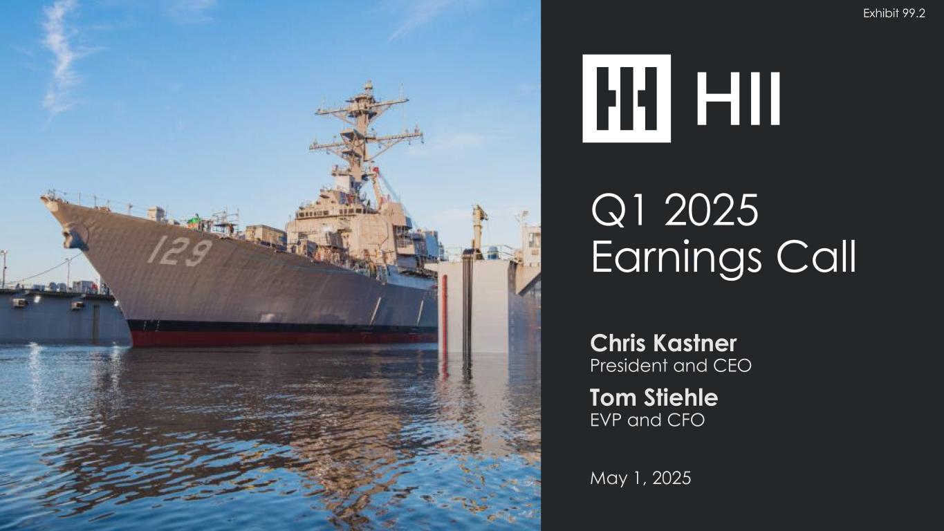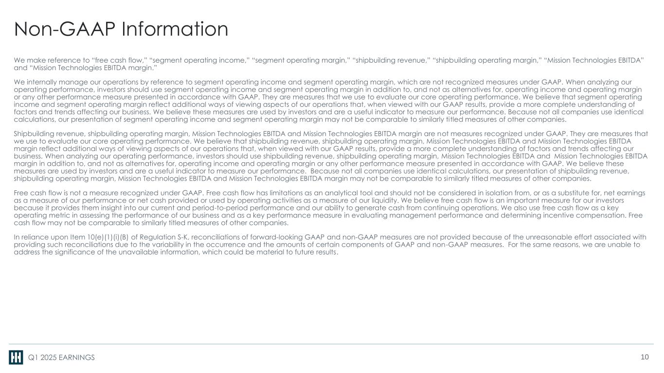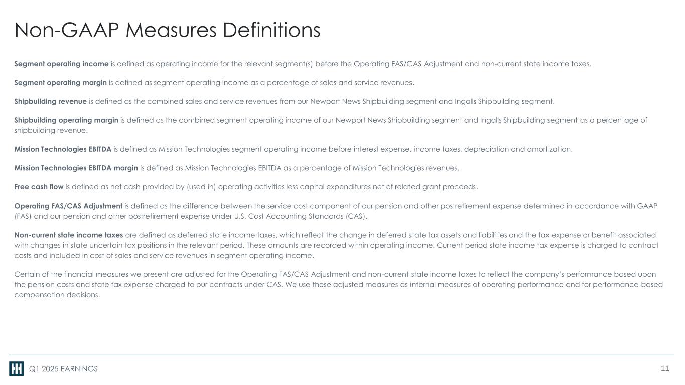 Q1 2025 EARNINGS Non-GAAP Information We make reference to “free cash flow,” “segment operating income,” “segment operating margin,” “shipbuilding revenue,” “shipbuilding operating margin,” “Mission Technologies EBITDA” and “Mission Technologies EBITDA margin.” We internally manage our operations by reference to segment operating income and segment operating margin, which are not recognized measures under GAAP. When analyzing our operating performance, investors should use segment operating income and segment operating margin in addition to, and not as alternatives for, operating income and operating margin or any other performance measure presented in accordance with GAAP. They are measures that we use to evaluate our core operating performance. We believe that segment operating income and segment operating margin reflect additional ways of viewing aspects of our operations that, when viewed with our GAAP results, provide a more complete understanding of factors and trends affecting our business. We believe these measures are used by investors and are a useful indicator to measure our performance. Because not all companies use identical calculations, our presentation of segment operating income and segment operating margin may not be comparable to similarly titled measures of other companies. Shipbuilding revenue, shipbuilding operating margin, Mission Technologies EBITDA and Mission Technologies EBITDA margin are not measures recognized under GAAP. They are measures that we use to evaluate our core operating performance. We believe that shipbuilding revenue, shipbuilding operating margin, Mission Technologies EBITDA and Mission Technologies EBITDA margin reflect additional ways of viewing aspects of our operations that, when viewed with our GAAP results, provide a more complete understanding of factors and trends affecting our business. When analyzing our operating performance, investors should use shipbuilding revenue, shipbuilding operating margin, Mission Technologies EBITDA and Mission Technologies EBITDA margin in addition to, and not as alternatives for, operating income and operating margin or any other performance measure presented in accordance with GAAP. We believe these measures are used by investors and are a useful indicator to measure our performance. Because not all companies use identical calculations, our presentation of shipbuilding revenue, shipbuilding operating margin, Mission Technologies EBITDA and Mission Technologies EBITDA margin may not be comparable to similarly titled measures of other companies. Free cash flow is not a measure recognized under GAAP. Free cash flow has limitations as an analytical tool and should not be considered in isolation from, or as a substitute for, net earnings as a measure of our performance or net cash provided or used by operating activities as a measure of our liquidity. We believe free cash flow is an important measure for our investors because it provides them insight into our current and period-to-period performance and our ability to generate cash from continuing operations. We also use free cash flow as a key operating metric in assessing the performance of our business and as a key performance measure in evaluating management performance and determining incentive compensation. Free cash flow may not be comparable to similarly titled measures of other companies. In reliance upon Item 10(e)(1)(i)(B) of Regulation S-K, reconciliations of forward-looking GAAP and non-GAAP measures are not provided because of the unreasonable effort associated with providing such reconciliations due to the variability in the occurrence and the amounts of certain components of GAAP and non-GAAP measures. For the same reasons, we are unable to address the significance of the unavailable information, which could be material to future results. 10