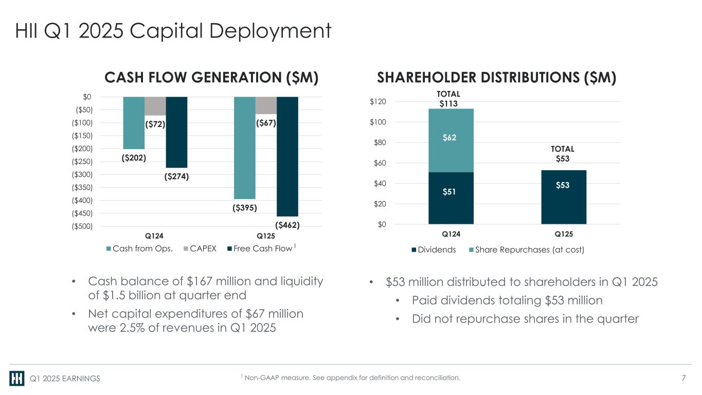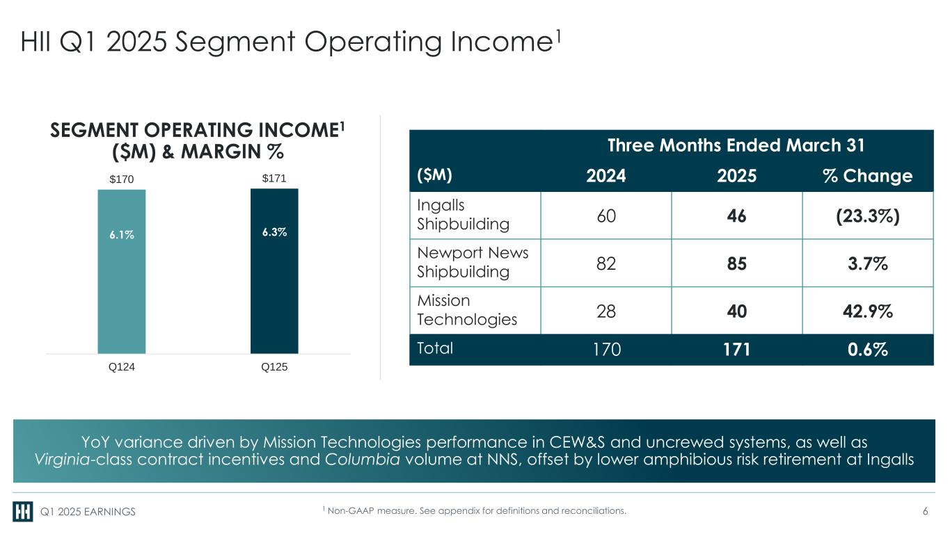 Q1 2025 EARNINGS HII Q1 2025 Segment Operating Income1 6.1% 9.8% 3.7% 1 Non-GAAP measure. See appendix for definitions and reconciliations. Three Months Ended March 31 ($M) 2024 2025 % Change Ingalls Shipbuilding 60 46 (23.3%) Newport News Shipbuilding 82 85 3.7% Mission Technologies 28 40 42.9% Total 170 171 0.6% SEGMENT OPERATING INCOME1 ($M) & MARGIN % $170 $171 Q124 Q125 6.1% 6.3% YoY variance driven by Mission Technologies performance in CEW&S and uncrewed systems, as well as Virginia-class contract incentives and Columbia volume at NNS, offset by lower amphibious risk retirement at Ingalls 6