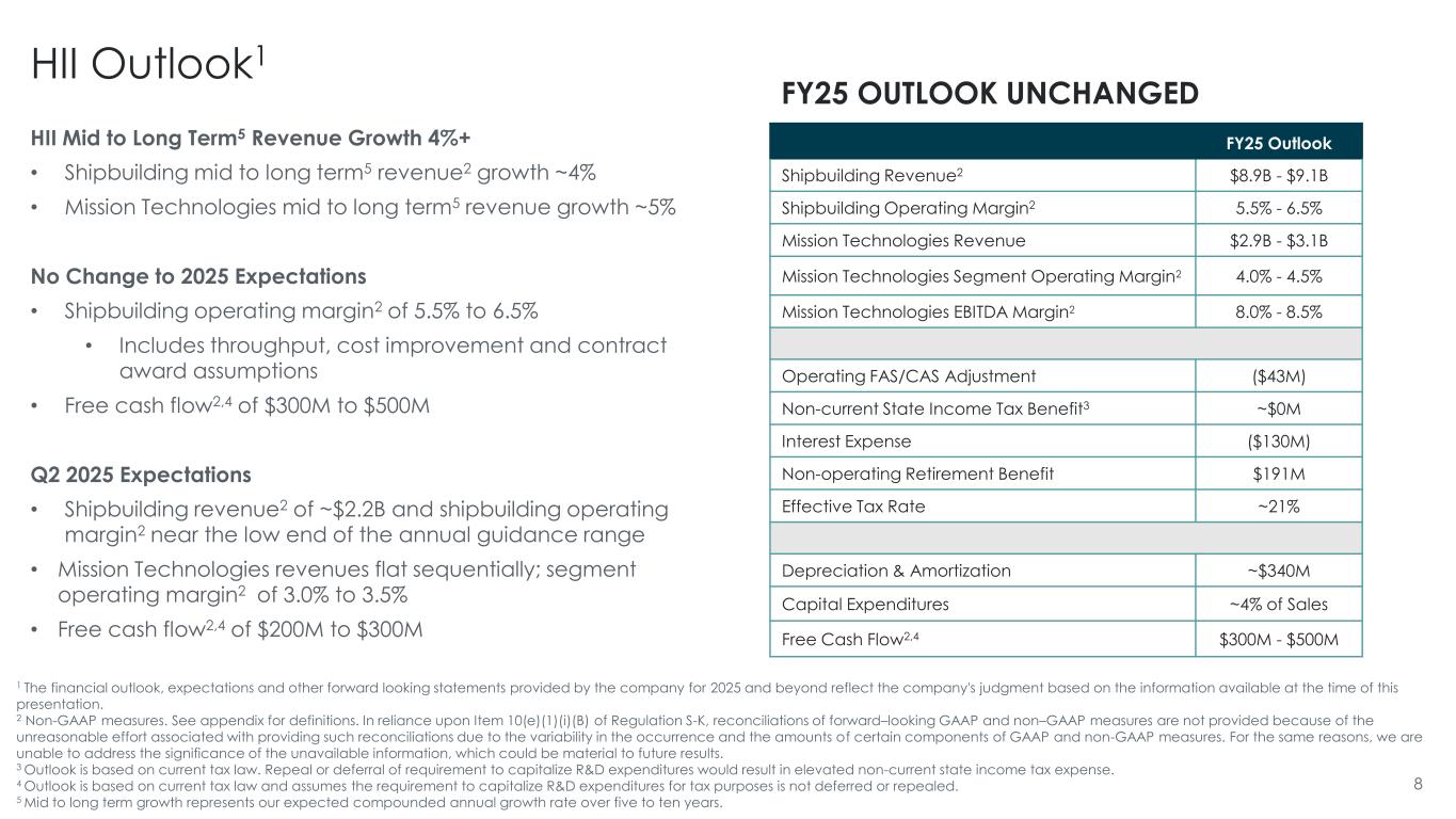 Q1 2025 EARNINGS HII Q1 2025 Capital Deployment 1 Non-GAAP measure. See appendix for definition and reconciliation. 7 ($202) ($395) ($72) ($67) ($274) ($462)($500) ($450) ($400) ($350) ($300) ($250) ($200) ($150) ($100) ($50) $0 Cash from Ops. CAPEX Free Cash Flow CASH FLOW GENERATION ($M) Q125Q124 1 $0 $20 $40 $60 $80 $100 $120 Q124 Q125 Dividends Share Repurchases (at cost) SHAREHOLDER DISTRIBUTIONS ($M) TOTAL $53 TOTAL $113 $162 $53 $62 $51 • Cash balance of $167 million and liquidity of $1.5 billion at quarter end • Net capital expenditures of $67 million were 2.5% of revenues in Q1 2025 • $53 million distributed to shareholders in Q1 2025 • Paid dividends totaling $53 million • Did not repurchase shares in the quarter