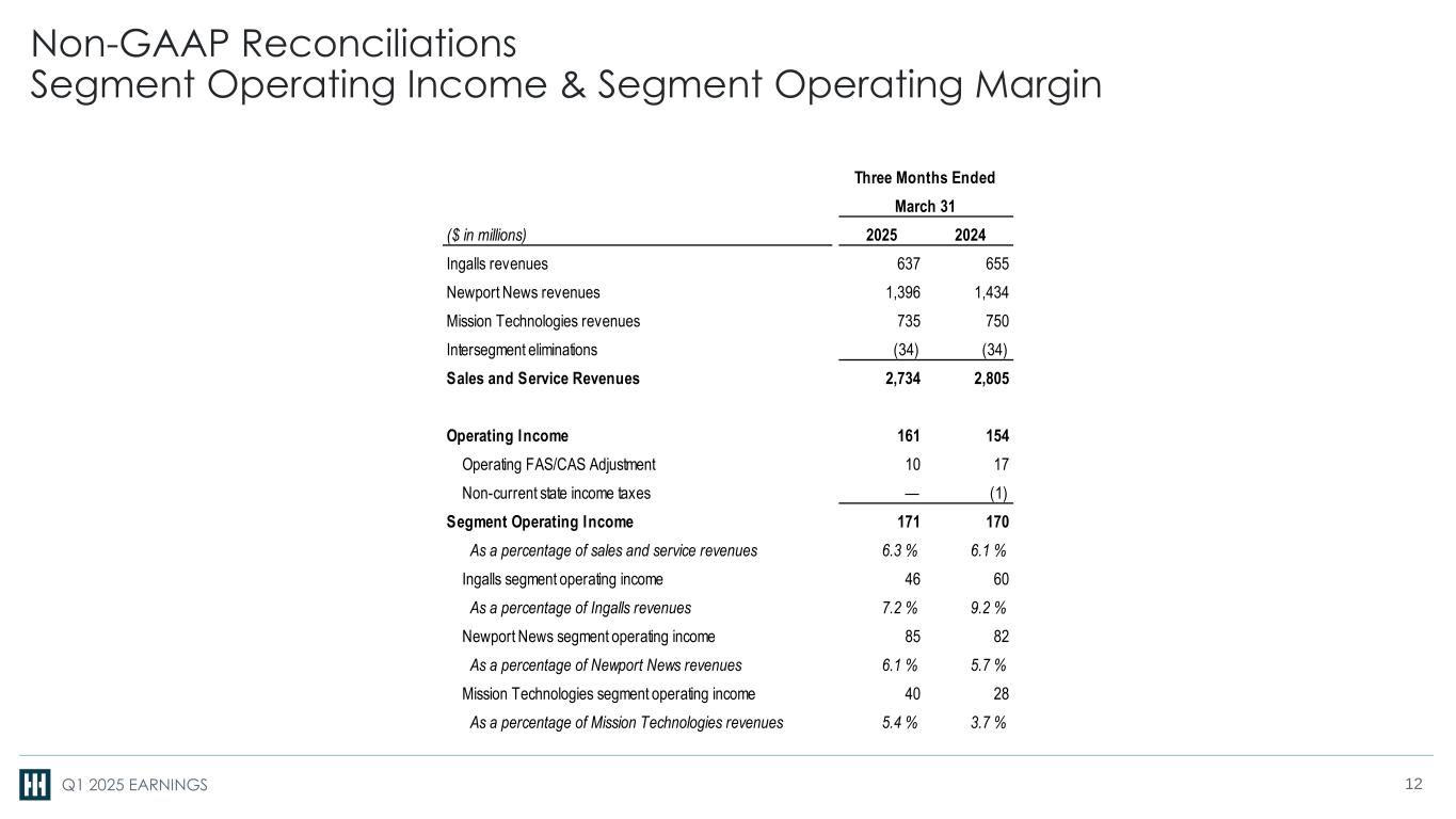 Q1 2025 EARNINGS Non-GAAP Measures Definitions Segment operating income is defined as operating income for the relevant segment(s) before the Operating FAS/CAS Adjustment and non-current state income taxes. Segment operating margin is defined as segment operating income as a percentage of sales and service revenues. Shipbuilding revenue is defined as the combined sales and service revenues from our Newport News Shipbuilding segment and Ingalls Shipbuilding segment. Shipbuilding operating margin is defined as the combined segment operating income of our Newport News Shipbuilding segment and Ingalls Shipbuilding segment as a percentage of shipbuilding revenue. Mission Technologies EBITDA is defined as Mission Technologies segment operating income before interest expense, income taxes, depreciation and amortization. Mission Technologies EBITDA margin is defined as Mission Technologies EBITDA as a percentage of Mission Technologies revenues. Free cash flow is defined as net cash provided by (used in) operating activities less capital expenditures net of related grant proceeds. Operating FAS/CAS Adjustment is defined as the difference between the service cost component of our pension and other postretirement expense determined in accordance with GAAP (FAS) and our pension and other postretirement expense under U.S. Cost Accounting Standards (CAS). Non-current state income taxes are defined as deferred state income taxes, which reflect the change in deferred state tax assets and liabilities and the tax expense or benefit associated with changes in state uncertain tax positions in the relevant period. These amounts are recorded within operating income. Current period state income tax expense is charged to contract costs and included in cost of sales and service revenues in segment operating income. Certain of the financial measures we present are adjusted for the Operating FAS/CAS Adjustment and non-current state income taxes to reflect the company’s performance based upon the pension costs and state tax expense charged to our contracts under CAS. We use these adjusted measures as internal measures of operating performance and for performance-based compensation decisions. 11