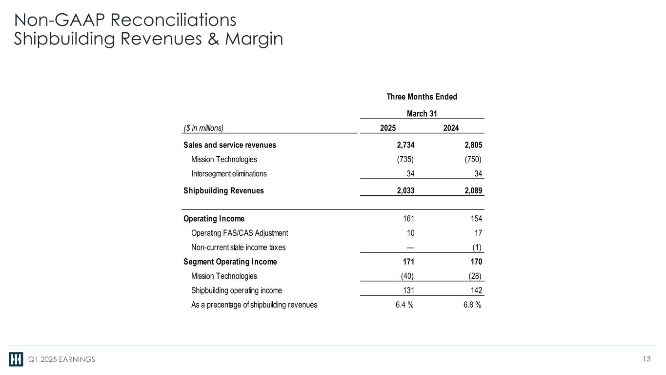 Q1 2025 EARNINGS Non-GAAP Reconciliations Segment Operating Income & Segment Operating Margin 12 ($ in millions) 2025 2024 Ingalls revenues 637 655 Newport News revenues 1,396 1,434 Mission Technologies revenues 735 750 Intersegment eliminations (34) (34) Sales and Service Revenues 2,734 2,805 Operating Income 161 154 Operating FAS/CAS Adjustment 10 17 Non-current state income taxes — (1) Segment Operating Income 171 170 As a percentage of sales and service revenues 6.3 % 6.1 % Ingalls segment operating income 46 60 As a percentage of Ingalls revenues 7.2 % 9.2 % Newport News segment operating income 85 82 As a percentage of Newport News revenues 6.1 % 5.7 % Mission Technologies segment operating income 40 28 As a percentage of Mission Technologies revenues 5.4 % 3.7 % March 31 Three Months Ended