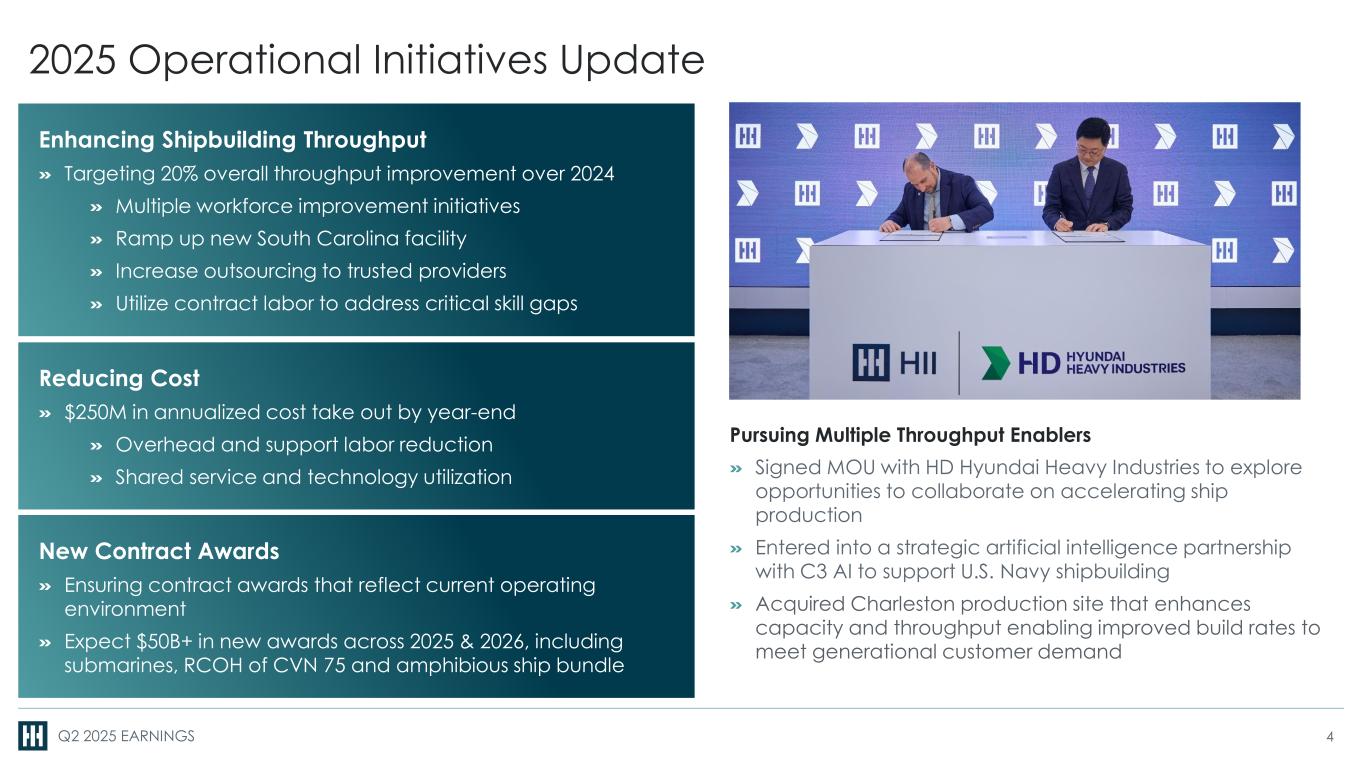 Q2 2025 EARNINGS 3 HII INVESTMENT THESIS Largest U.S. military seapower provider with leading all-domain, integrated defense technologies Margin expansion opportunity driven by operational execution and new post-COVID contracts Free cash flow1 growth enabling disciplined capital allocation and increasing total shareholder value Working through the majority of challenged pre-COVID contracts, focused on enhancing throughput and reducing cost – Top priority to get these ships delivered to the Navy Expect over $50B of contract awards, establishing balanced risk equation and margins more consistent with industry norms Over the course of 2025 and 2026: Mid to Long Term: Top line growth of 4%+; $15B enterprise revenue by 2030 1 Non-GAAP measure. See appendix for definitions and reconciliations.