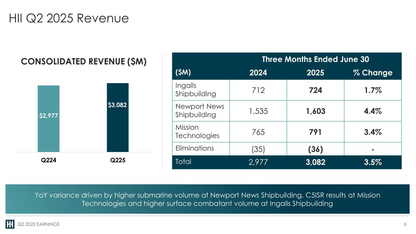 Q2 2025 EARNINGS HII Q2 2025 Revenue 6.1% 9.8% 3.7% CONSOLIDATED REVENUE ($M) $2,977 $3,082 Q224 Q225 Three Months Ended June 30 ($M) 2024 2025 % Change Ingalls Shipbuilding 712 724 1.7% Newport News Shipbuilding 1,535 1,603 4.4% Mission Technologies 765 791 3.4% Eliminations (35) (36) - Total 2,977 3,082 3.5% YoY variance driven by higher submarine volume at Newport News Shipbuilding, C5ISR results at Mission Technologies and higher surface combatant volume at Ingalls Shipbuilding 6