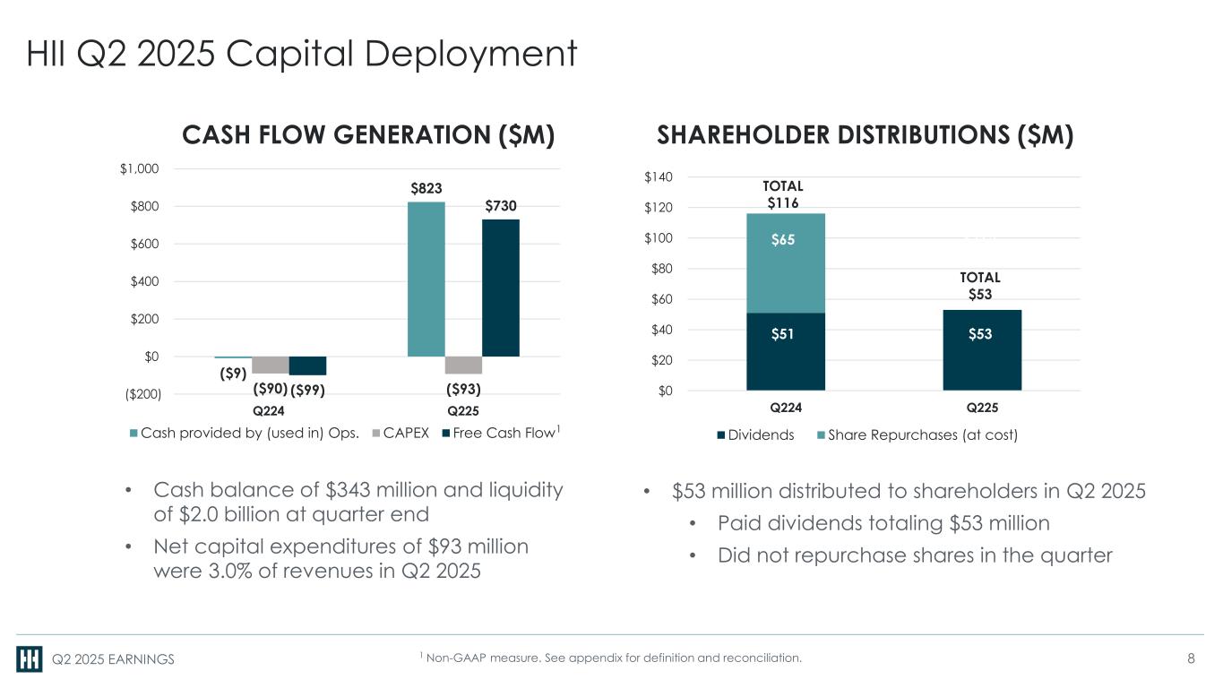 Q2 2025 EARNINGS HII Q2 2025 Segment Operating Income1 6.1% 9.8% 3.7% 1 Non-GAAP measure. See appendix for definitions and reconciliations. Three Months Ended June 30 ($M) 2024 2025 % Change Ingalls Shipbuilding 56 54 (3.6%) Newport News Shipbuilding 111 82 (26.1%) Mission Technologies 36 36 0.0% Total 203 172 (15.3%) SEGMENT OPERATING INCOME1 ($M) & MARGIN % $203 $172 Q224 Q225 6.8% 5.6% YoY variance driven by Virginia-class and aircraft carrier construction performance at Newport News Shipbuilding 7