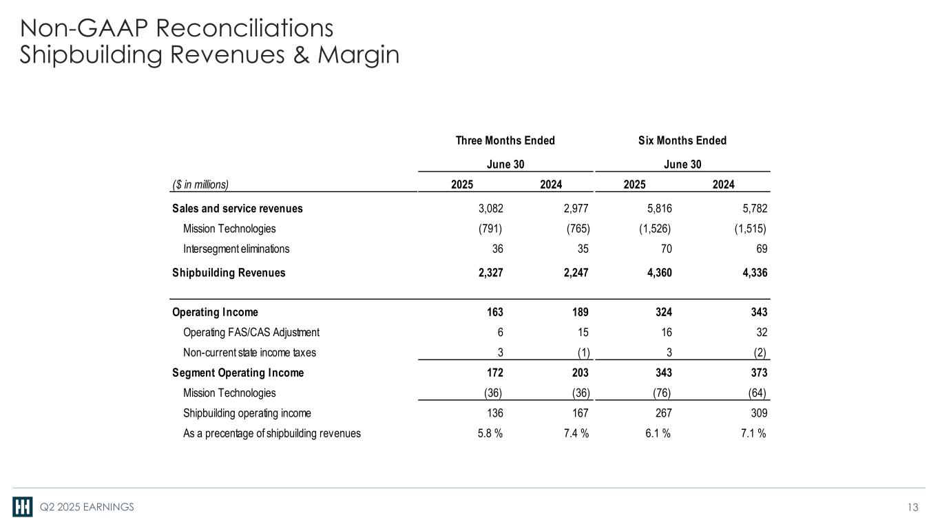 Q2 2025 EARNINGS Non-GAAP Reconciliations Segment Operating Income & Segment Operating Margin 12 ($ in millions) 2025 2024 2025 2024 Ingalls revenues 724 712 1,361 1,367 Newport News revenues 1,603 1,535 2,999 2,969 Mission Technologies revenues 791 765 1,526 1,515 Intersegment eliminations (36) (35) (70) (69) Sales and Service Revenues 3,082 2,977 5,816 5,782 Operating Income 163 189 324 343 Operating FAS/CAS Adjustment 6 15 16 32 Non-current state income taxes 3 (1) 3 (2) Segment Operating Income 172 203 343 373 As a percentage of sales and service revenues 5.6 % 6.8 % 5.9 % 6.5 % Ingalls segment operating income 54 56 100 116 As a percentage of Ingalls revenues 7.5 % 7.9 % 7.3 % 8.5 % Newport News segment operating income 82 111 167 193 As a percentage of Newport News revenues 5.1 % 7.2 % 5.6 % 6.5 % Mission Technologies segment operating income 36 36 76 64 As a percentage of Mission Technologies revenues 4.6 % 4.7 % 5.0 % 4.2 % Three Months Ended June 30 June 30 Six Months Ended