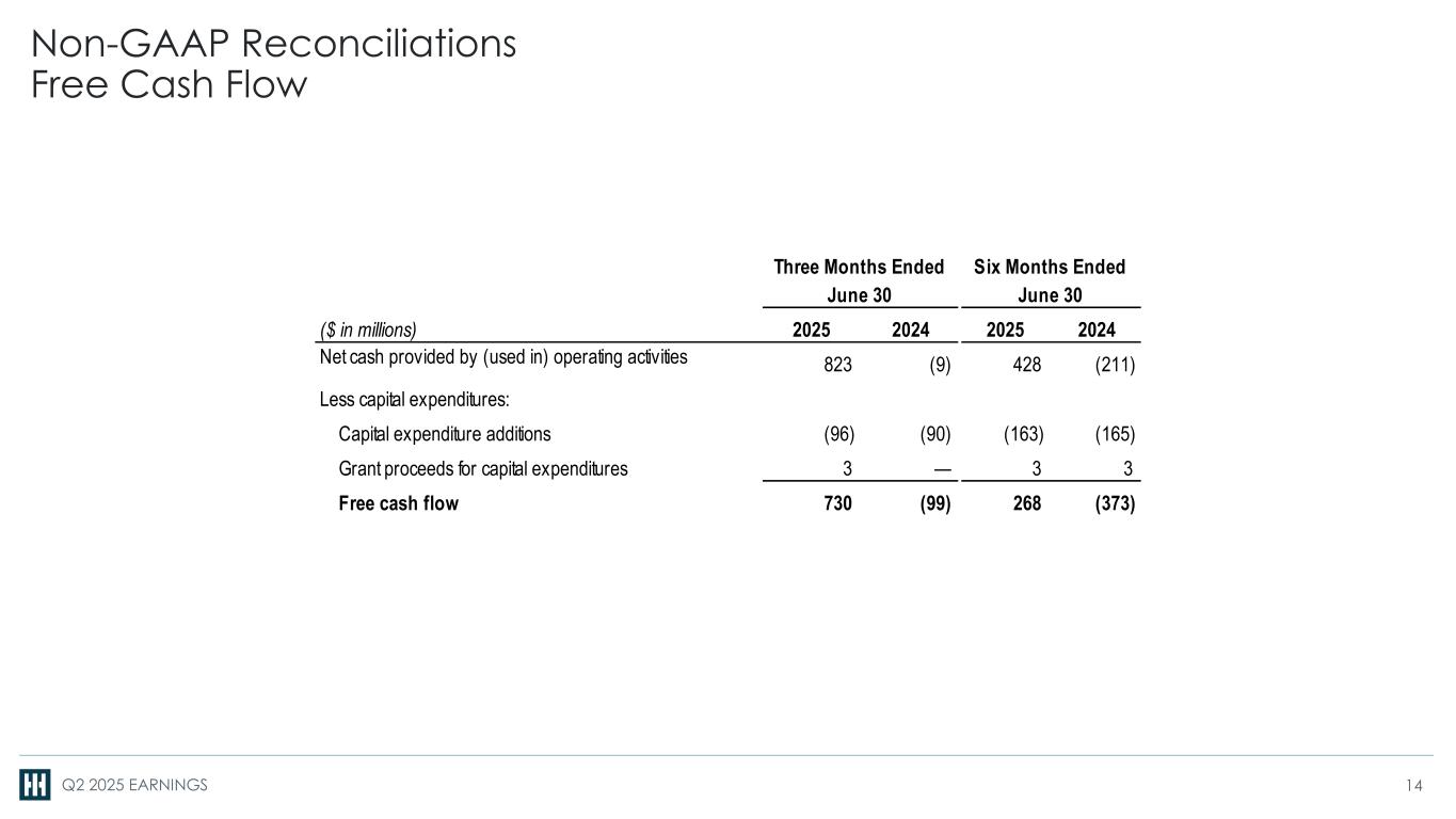 Q2 2025 EARNINGS Non-GAAP Reconciliations Free Cash Flow 14 ($ in millions) 2025 2024 2025 2024 Net cash provided by (used in) operating activities 823 (9) 428 (211) Less capital expenditures: Capital expenditure additions (96) (90) (163) (165) Grant proceeds for capital expenditures 3 — 3 3 Free cash flow 730 (99) 268 (373) Three Months Ended June 30 June 30 Six Months Ended