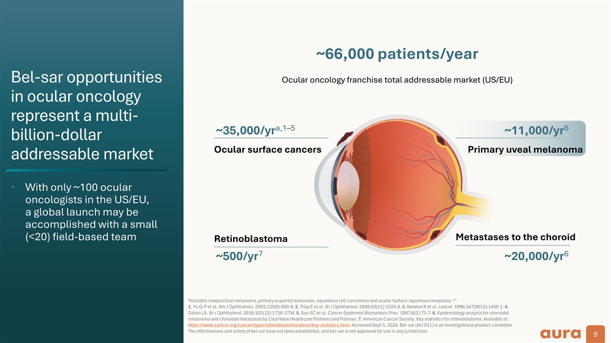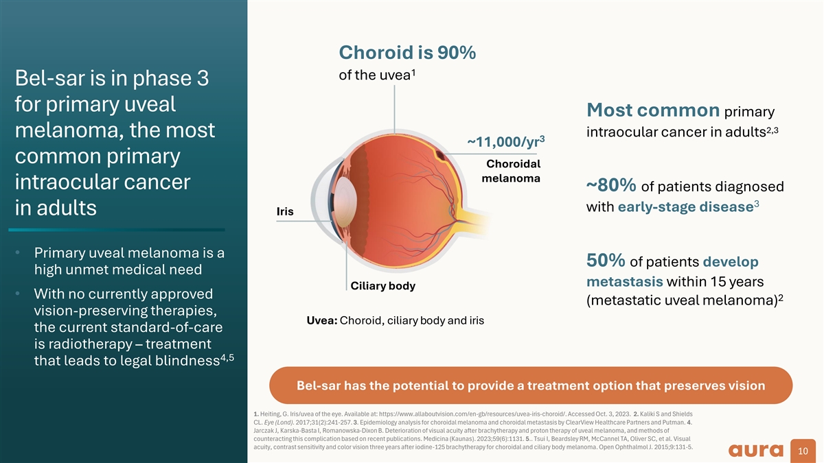 ~66,000 patients/year Bel-sar opportunities Ocular oncology franchise total addressable market (US/EU) in ocular oncology represent a multi- a,1–5 6 ~35,000/yr ~11,000/yr billion-dollar Ocular surface cancers Primary uveal melanoma addressable market • With only ~100 ocular oncologists in the US/EU, a global launch may be accomplished with a small (<20) field-based team Metastases to the choroid Retinoblastoma 7 6 ~500/yr ~20,000/yr a 1-5 Includes conjunctival melanoma, primary acquired melanosis, squamous cell carcinoma and ocular surface squamous neoplasia. 1. Yu G-P et al. Am J Ophthalmol. 2003;135(6):800-6. 2. Triay E et al. Br J Ophthalmol. 2009;93(11):1524-8. 3. Newton R et al. Lancet. 1996;347(9013):1450-1. 4. Dalvin LA. Br J Ophthalmol. 2018;102(12):1728-1734. 5. Sun EC et al. Cancer Epidemiol Biomarkers Prev. 1997;6(2):73-7. 6. Epidemiology analysis for choroidal melanoma and choroidal metastasis by ClearView Healthcare Partners and Putman. 7. American Cancer Society. Key statistics for retinoblastoma. Available at: https://www.cancer.org/cancer/types/retinoblastoma/about/key-statistics.html. Accessed Sept 5, 2024. Bel-sar (AU-011) is an investigational product candidate The effectiveness and safety of bel-sar have not been established, and bel-sar is not approved for use in any jurisdiction. 9