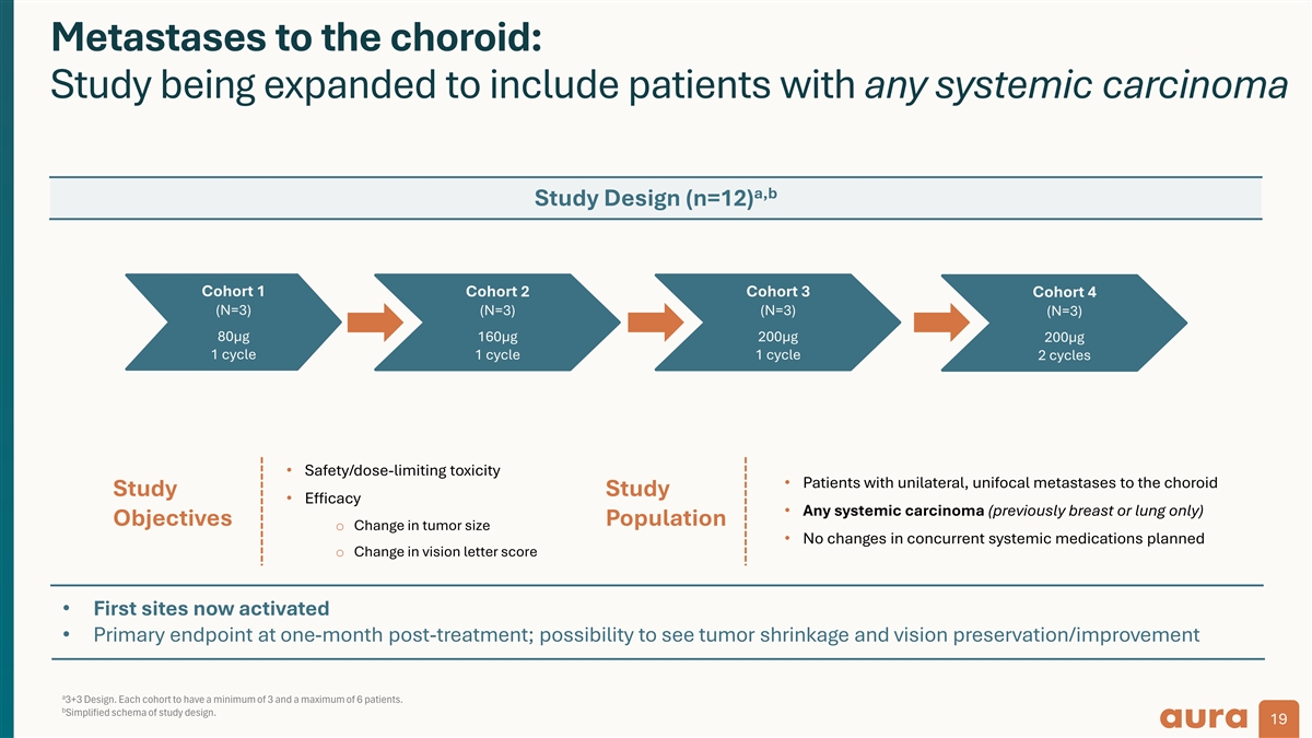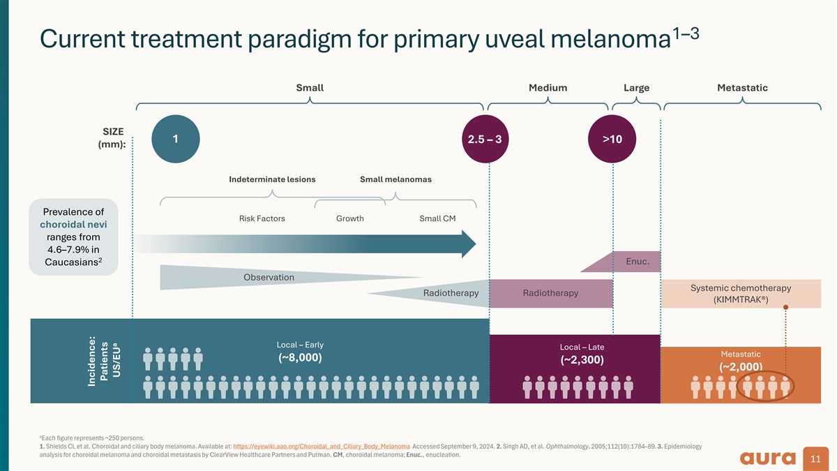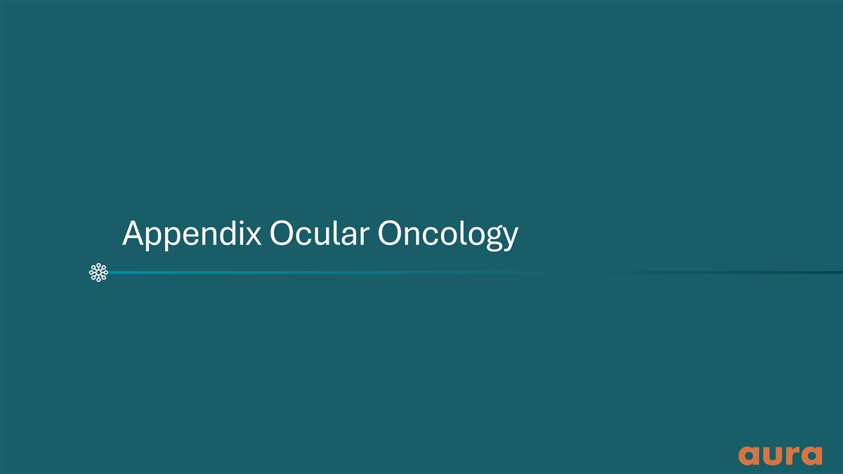 Product-Limit Survival Estimates With Number of Subjects at Risk 11 1 .0 ..0 0 + + C e Cn en ss oo re red d Time to tumor 00 0 .8 ..8 8 progression 00 0 .6 ..6 6 P = 0.0005 Change from baseline in thickness ≥0.5 mm; or in LBD ≥1.5 mm 0.4 0 0..4 4 confirmed by at least one Phase 2 end of study repeat assessment 00 0 .2 ..2 2 data represented 00 0 .0 ..0 0 using planned phase 3 Therapeutic 0 0 1 10 00 0 2 20 00 0 3 30 00 0 4 40 00 0 5 50 00 0 0 100 200 300 400 500 n=10 Product-Limit Survival Estimates Treatment duration (days) endpoints t td du ur rx x With Number of Subjects at Risk Subtherapeutic t tr rt tp p 3 3 C Cy yc cl le e 2 2 C Cy yc cl le e 11 1 .0 ..0 0 + Censored n=10 + Censored Kaplan-Meier analysis simulation 00 0 .8 ..8 8 10 10 9 9 8 0 3 Cycle 10 7 7 1 0 2 Cycle of time-to-event Time to composite 00 0 .6 ..6 6 endpoint 00 0 .4 ..4 4 P = 0.0008 Time to tumor progression or vision acuity failure (≥15 letter loss 0.2 0 0..2 2 in ETDRS-BCVA), whichever occurs earlier 00 0 .0 ..0 0 0 0 1 10 00 0 2 20 00 0 3 30 00 0 4 40 00 0 5 50 00 0 0 100 200 300 400 500 Treatment duration (days) t td du ur rx x t tr rt tp p 3 3 C Cy yc cl le e 2 2 C Cy yc cl le e Study duration 12 months. Participants either had an event or were censored at the last visit; some had their Week 52 visit after 365 days. Any events at the final visit are assigned to the actual time of that visit. Log-rank test p-value based on unsimulated original Kaplan-Meier curves. BCVA, best-corrected visual acuity; ETDRS, Early Treatment Diabetic Retinopathy Study; LBD, largest basal diameter. ClinicalTrials.gov Identifiers: NCT04417530; AU-011-202 (phase 2); NCT06007690; AU-011-301 (phase 3). 10 10 9 8 7 0 3 Cycle Data on file, Aura Biosciences. 10 7 7 1 0 2 Cycle 15 Su S Su u rr r vv v iv i iv v al a al l p P Prr rob o ob ba a ab b bi il lil i it tit y yy Survival probability S Su ur rv vi iv va al l P Pr ro ob ba ab bi il li it ty y