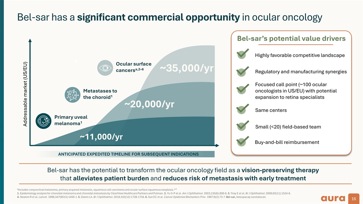 Metastases to the choroid: Clinical translation of multiple tumor types that could be impacted by bel-sar Platform potential in multiple solid tumors CNS cancers Ocular surface cancers Choroidal metastasis 3 Multiple tumor types metastasize to the eye Head and Neck Uveal melanoma Cancer Retinoblastoma Cutaneous melanoma Breast Breast Colon Lung Treat metastases 2 2 ~832,000/yr ~448,000/yr to the choroid Colon Renal Ovary Urothelial Carcinoma Cervix Prostate Prostate Lung 2 2 ~703,000/yr ~710,000/yr Fibrosarcoma 1 2 ~20,000/yr ~2,693,000/yr US/EU incidence. 1. Epidemiology analysis for choroidal melanoma and choroidal metastasis by ClearView Healthcare Partners and Putman. 2. IARC Cancer Today. GLOBOCAN 2022 (version 1.1). Available at: Cancer Today. Accessed May 6, 2025. 3. Mathis T et al. Prog Ret Eye Res. 2019;68:144-176. Bel-sar (AU-011) is an investigational product candidate. The effectiveness and safety of bel-sar have not been established or clinically evaluated in tumors outside the ocular or bladder setting, and bel-sar is not approved for use in any jurisdiction. 17