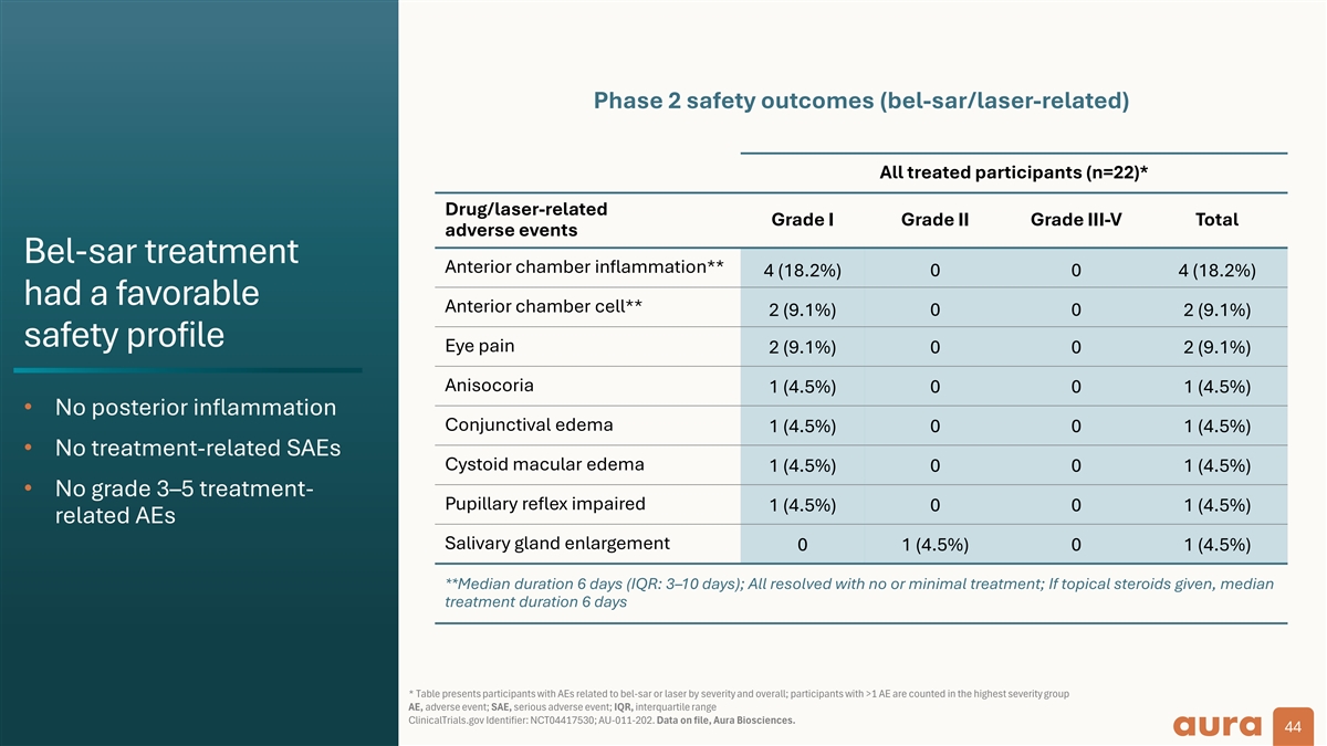 Phase 2 safety outcomes (bel-sar/laser-related) All treated participants (n=22)* Drug/laser-related Grade I Grade II Grade III-V Total adverse events Bel-sar treatment Anterior chamber inflammation** 4 (18.2%) 0 0 4 (18.2%) had a favorable Anterior chamber cell** 2 (9.1%) 0 0 2 (9.1%) safety profile Eye pain 2 (9.1%) 0 0 2 (9.1%) Anisocoria 1 (4.5%) 0 0 1 (4.5%) • No posterior inflammation Conjunctival edema 1 (4.5%) 0 0 1 (4.5%) • No treatment-related SAEs Cystoid macular edema 1 (4.5%) 0 0 1 (4.5%) • No grade 3–5 treatment- Pupillary reflex impaired 1 (4.5%) 0 0 1 (4.5%) related AEs Salivary gland enlargement 0 1 (4.5%) 0 1 (4.5%) **Median duration 6 days (IQR: 3–10 days); All resolved with no or minimal treatment; If topical steroids given, median treatment duration 6 days * Table presents participants with AEs related to bel-sar or laser by severity and overall; participants with >1 AE are counted in the highest severity group AE, adverse event; SAE, serious adverse event; IQR, interquartile range ClinicalTrials.gov Identifier: NCT04417530; AU-011-202. Data on file, Aura Biosciences. 44