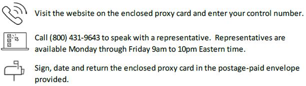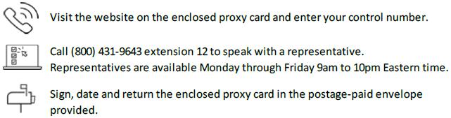 If you vote now, you will ensure your shares are represented and we will not contact you further on this issue. Detailed information about the Special Meeting and the proposal can be found in the Proxy Statement. If you have any questions about the proposal, contact your financial advisor, client service representative or AST Fund Solutions at (800) 431-9643.