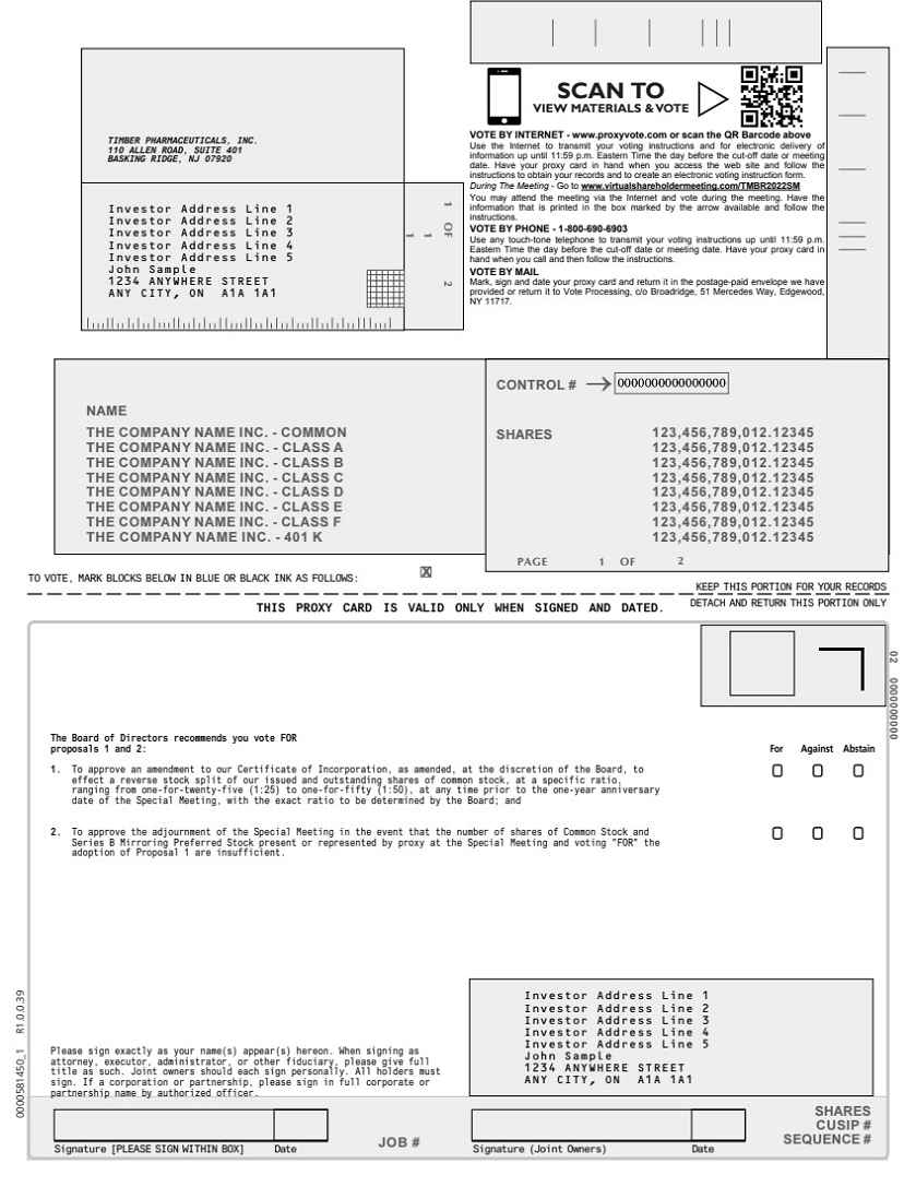 ![]() | 11 123456781 234567 81 234567 81 234567 81 234567 81 234567 81 234567 812345678 NAMETHE COMPANY NAME INC. - COMMON123,456,789,012.12345THE COMPANY NAME INC. - CLASS A123,456,789,012.12345THE COMPANY NAME INC. - CLASS B123,456,789,012.12345THE COMPANY NAME INC. - CLASS C123,456,789,012.12345THE COMPANY NAME INC. - CLASS D123,456,789,012.12345THE COMPANY NAME INC. - CLASS E123,456,789,012.12345THE COMPANY NAME INC. - CLASS F123,456,789,012.12345THE COMPANY NAME INC. - 401 K123,456,789,012.12345→ x020000000000JOB #1 OF21 OF2PAGESHARESCUSIP #SEQUENCE #THIS PROXY CARD IS VALID ONLY WHEN SIGNED AND DATED.KEEP THIS PORTION FOR YOUR RECORDSDETACH AND RETURN THIS PORTION ONLYTO VOTE, MARK BLOCKS BELOW IN BLUE OR BLACK INK AS FOLLOWS: Signature (Joint Owners)Signature [PLEASE SIGN WITHIN BOX]DateDate CONTROL #SHARES SCAN TO VIEW MATERIALS & VOTE 0 0 00 0 00000581385_1 R1.0.0.39 TIMBER PHARMACEUTICALS, INC.110 ALLEN ROAD, SUITE 401 BASKING RIDGE, NJ 07920Investor Address Line 1Investor Address Line 2 Investor Address Line 3 Investor Address Line 4 Investor Address Line 5 John Sample 1234 ANYWHERE STREET ANY CITY, ON A1A 1A1Investor Address Line 1 Investor Address Line 2 Investor Address Line 3 Investor Address Line 4 Investor Address Line 5 John Sample 1234 ANYWHERE STREET ANY CITY, ON A1A 1A1 VOTE BY INTERNET - www.proxyvote.com or scan the QR Barcode aboveUsetheInternettotransmityourvotinginstructionsandforelectronicdeliveryofinformationupuntil11:59p.m.EasternTimethedaybeforethecut-offdateormeeting date.Haveyourproxycardinhandwhenyouaccessthewebsiteandfollowthe instructions to obtain your records and to create an electronic voting instruction form.During The Meeting- Go towww.virtualshareholdermeeting.com/TMBR2022SM YoumayattendthemeetingviatheInternetandvoteduringthemeeting.Havetheinformationthatisprintedintheboxmarkedbythearrowavailableandfollowthe instructions.VOTE BY PHONE - 1-800-690-6903Useanytouch-tonetelephonetotransmityourvotinginstructionsupuntil11:59p.m.EasternTimethedaybeforethecut-offdateormeetingdate.Haveyourproxycardin hand when you call and then follow the instructions.VOTE BY MAILMark,signanddateyourproxycardandreturnitinthepostage-paidenvelopewehaveprovidedorreturnittoVoteProcessing,c/oBroadridge,51MercedesWay,Edgewood, NY 11717. The Board of Directors recommends you vote FORproposals 1 and 2.ForAgainstAbstain 1.To an approve amendment to our Certificate of Incorporation, as amended, at the discretion of the Board, to effect a reverse stock split of our issued and outstanding shares of common stock, at a specific ratio, ranging from one-for-twenty-five (1:25) to one-for-fifty (1:50), at any time prior to the one-year anniversary date of the Special Meeting, with the exact ratio to be determined by the Board; and2.To approve the adjournment of the Special Meeting in the event that the number of shares of Common Stock and Series B Mirroring Preferred Stock present or represented by proxy at the Special Meeting and voting "FOR" the adoption of Proposal 1 are insufficient. Please sign exactly as your name(s) appear(s) hereon. When signing asattorney, executor, administrator, or other fiduciary, please give fulltitle as such. Joint owners should each sign personally. All holders mustsign. If a corporation or partnership, please sign in full corporate or partnership name by authorized officer. |
