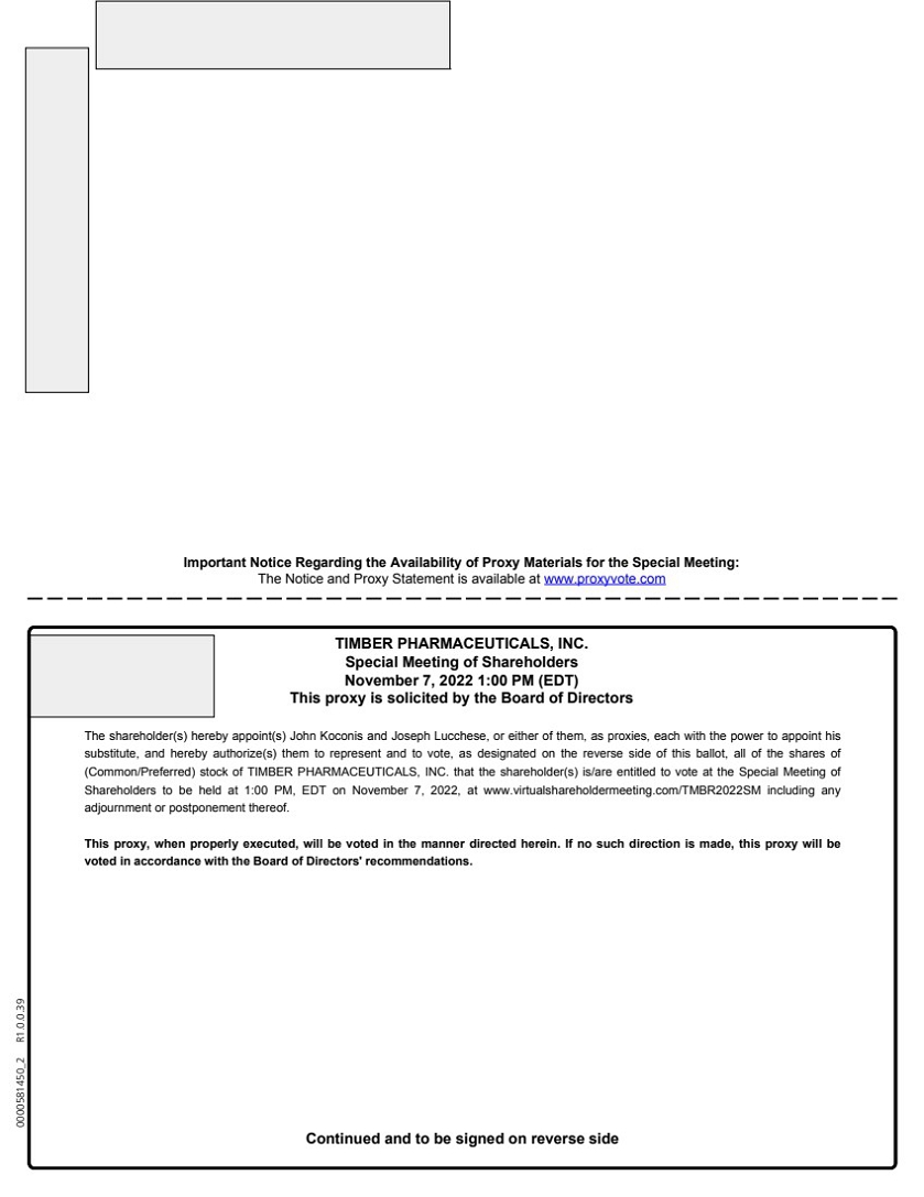![]() | 0000581385_2 R1.0.0.39 Important Notice Regarding the Availability of Proxy Materials for the Special Meeting:The Notice and Proxy Statement is available atwww.proxyvote.com Continued and to be signed on reverse side TIMBER PHARMACEUTICALS, INC.Special Meeting of ShareholdersNovember 7, 2022 1:00 PM (EDT)This proxy is solicited by the Board of DirectorsThe shareholder(s) hereby appoint(s) John Koconis and Joseph Lucchese, or either of them, as proxies, each with the power to appoint his substitute, and hereby authorize(s) them to represent and to vote, as designated on the reverse side of this ballot, all of the shares of (Common/Preferred) stock of TIMBER PHARMACEUTICALS, INC. that the shareholder(s) is/are entitled to vote at the Special Meeting of Shareholders to be held at 1:00 PM, EDT on November 7, 2022, at www.virtualshareholdermeeting.com/TMBR2022SM including any adjournment or postponement thereof.This proxy, when properly executed, will be voted in the manner directed herein. If no such direction is made, this proxy will be voted in accordance with the Board of Directors' recommendations. |