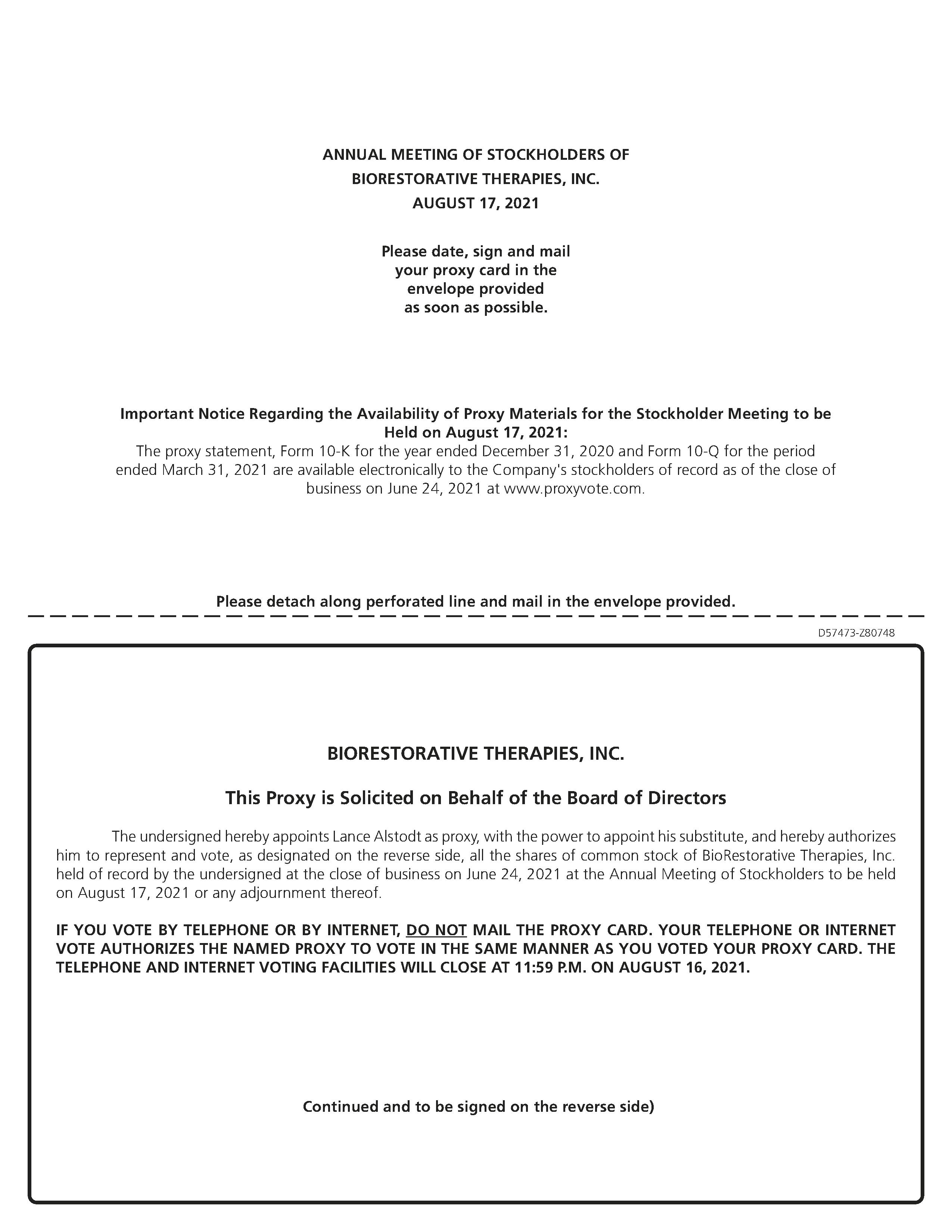 NOTICE IS HEREBY GIVEN that the Annual Meeting of Stockholders of BioRestorative Therapies, Inc., a Delaware corporation (the “Company”), will be held on