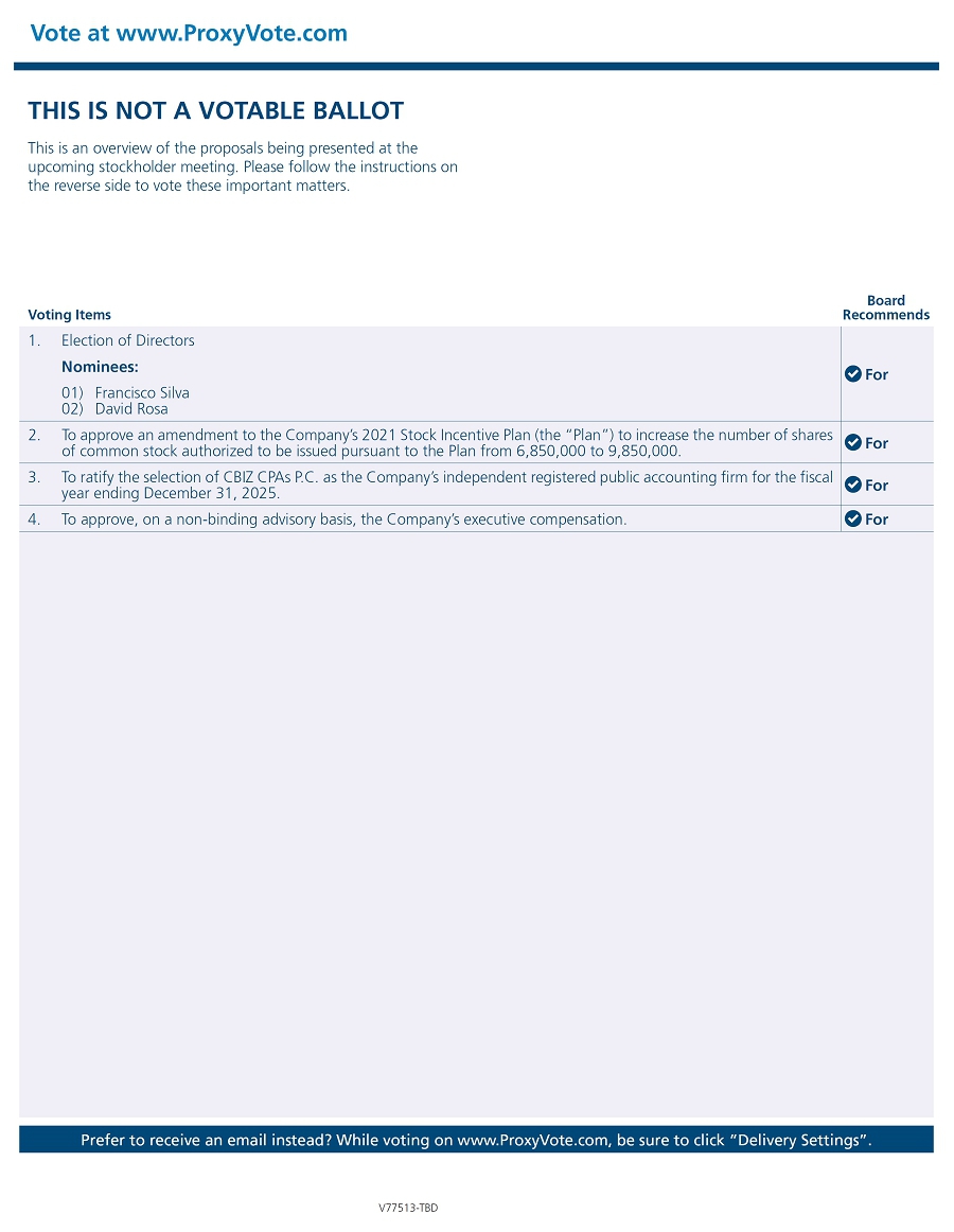 Important notice regarding the availability of Proxy Materials: We are sending a Notice of Internet Availability of Proxy Materials (the “Notice”) to our stockholders of record and beneficial owners, unless they have directed us to provide the materials in a different manner. The Notice provides instructions on how to access and review all of the important information contained in this proxy statement, as well as how to submit a proxy by telephone or over the Internet. If you receive the Notice and would still like to receive a printed copy of our proxy materials, instructions for requesting these materials are included in the Notice. The Company plans to mail the Notice to stockholders by August 8, 2025. The proxy statement and the Company’s Annual Report on Form 10-K for the fiscal year ended December 31, 2024, as filed with the Securities and Exchange Commission (the “SEC”) on March 28, 2025, are available electronically to the Company’s stockholders of record as of the close of business on July 31, 2025 at www.proxyvote.com.