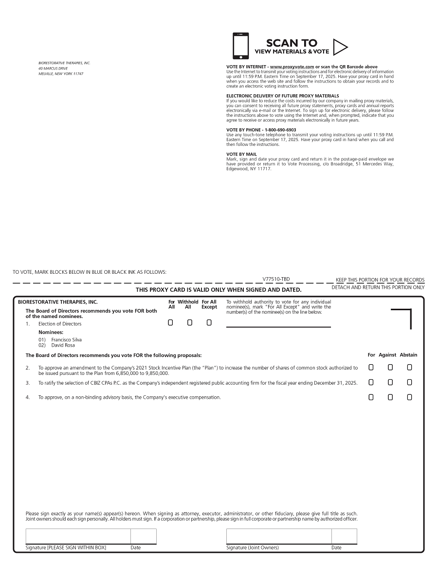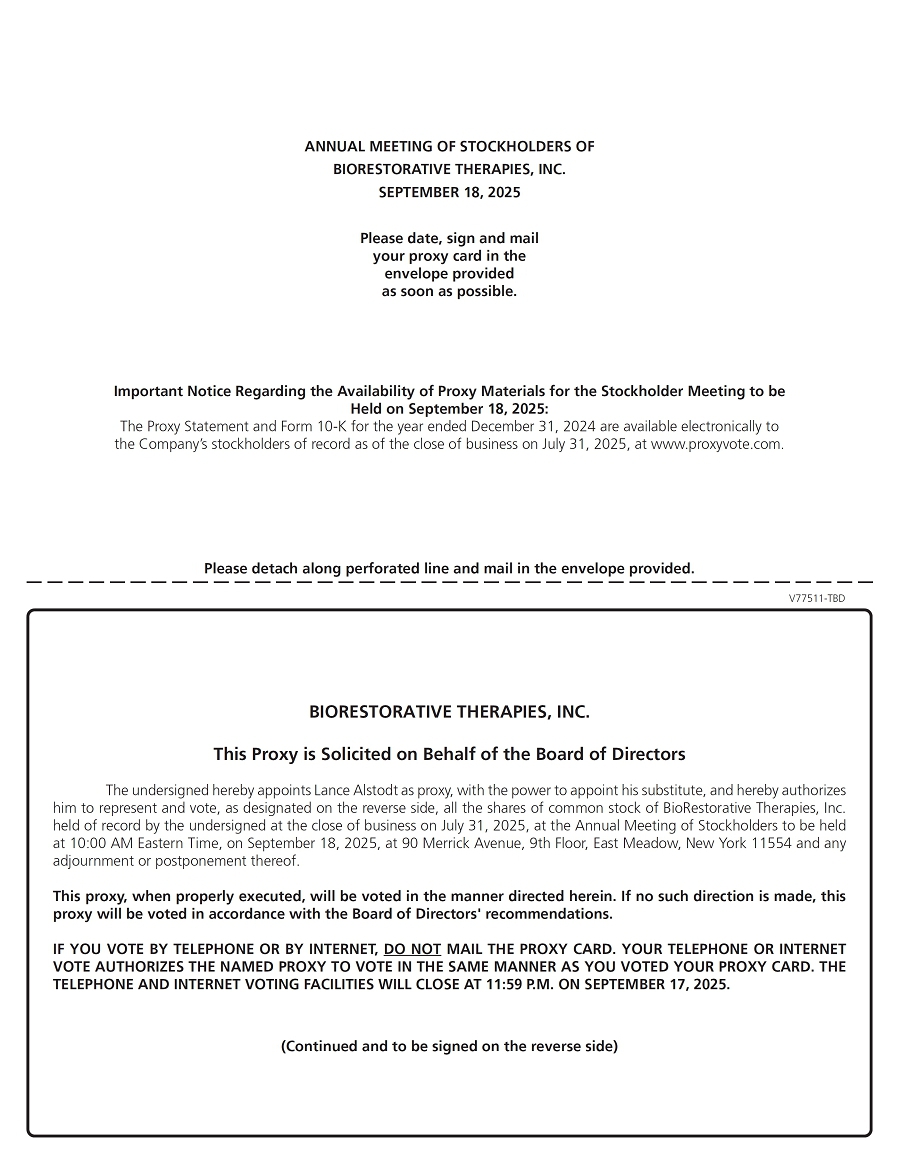 NOTICE IS HEREBY GIVEN that the Annual Meeting of Stockholders of BioRestorative Therapies, Inc., a Nevada corporation (the “Company”), will be held on September 18, 2025, at 90 Merrick Avenue, 9th Floor, East Meadow, New York, at 10:00 a.m., local time, for the following purposes: