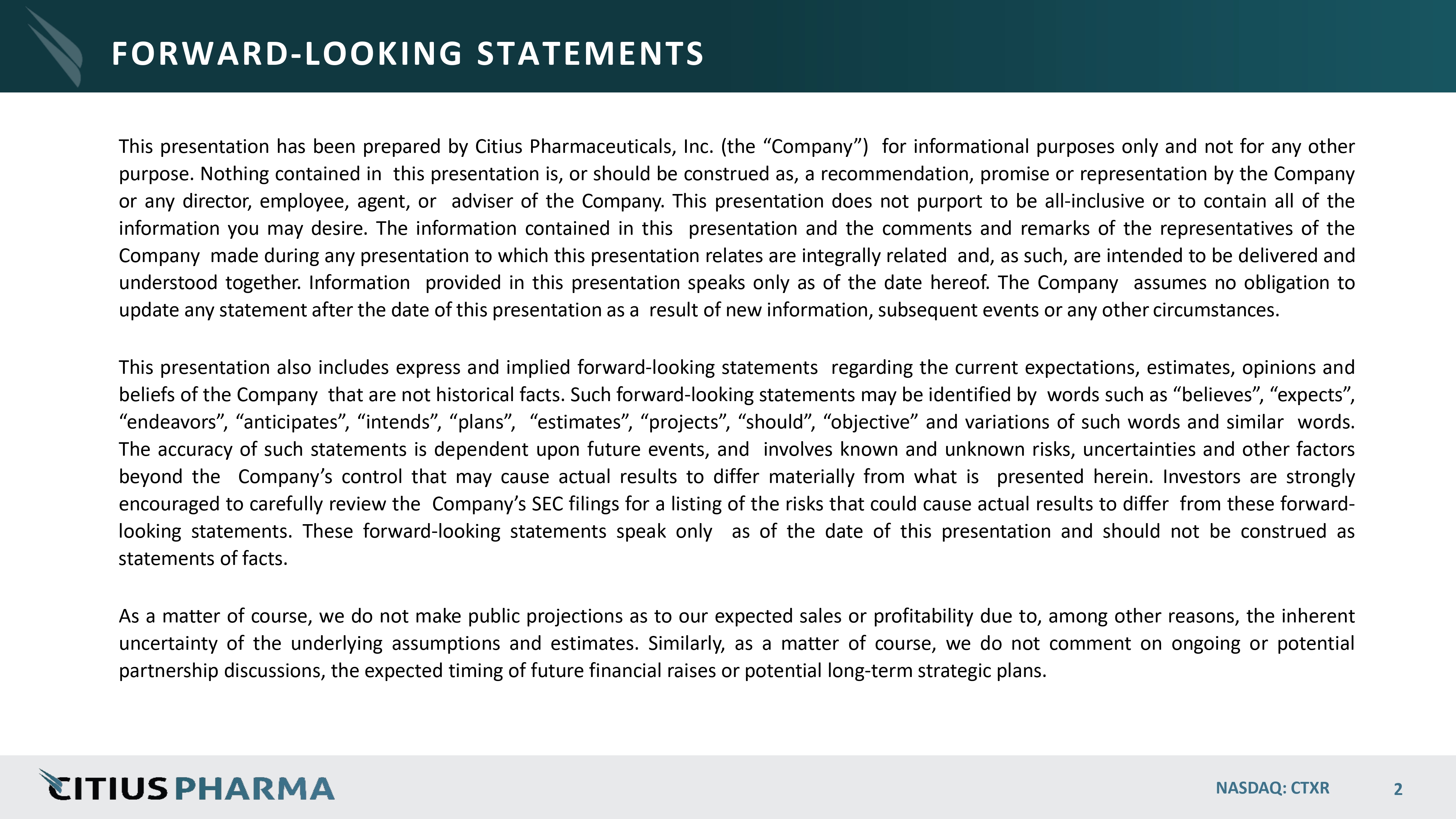 This presentation has been prepared by Citius Pharmaceuticals, Inc . (the “Company”) for informational purposes only and not for any other purpose . Nothing contained in this presentation is, or should be construed as, a recommendation, promise or representation by the Company or any director, employee, agent, or adviser of the Company . This presentation does not purport to be all - inclusive or to contain all of the information you may desire . The information contained in this presentation and the comments and remarks of the representatives of the Company made during any presentation to which this presentation relates are integrally related and, as such, are intended to be delivered and understood together . Information provided in this presentation speaks only as of the date hereof . The Company assumes no obligation to update any statement after the date of this presentation as a result of new information, subsequent events or any other circumstances . This presentation also includes express and implied forward - looking statements regarding the current expectations, estimates, opinions and beliefs of the Company that are not historical facts . Such forward - looking statements may be identified by words such as “believes”, “expects”, “endeavors”, “anticipates”, “intends”, “plans”, “estimates”, “projects”, “should”, “objective” and variations of such words and similar words . The accuracy of such statements is dependent upon future events, and involves known and unknown risks, uncertainties and other factors beyond the Company’s control that may cause actual results to differ materially from what is presented herein . Investors are strongly encouraged to carefully review the Company’s SEC filings for a listing of the risks that could cause actual results to differ from these forward - looking statements . These forward - looking statements speak only as of the date of this presentation and should not be construed as statements of facts . As a matter of course, we do not make public projections as to our expected sales or profitability due to, among other reasons, the inherent uncertainty of the underlying assumptions and estimates . Similarly, as a matter of course, we do not comment on ongoing or potential partnership discussions, the expected timing of future financial raises or potential long - term strategic plans . NASDAQ: CTXR 2 FORWARD - LOOKING STATEMENTS