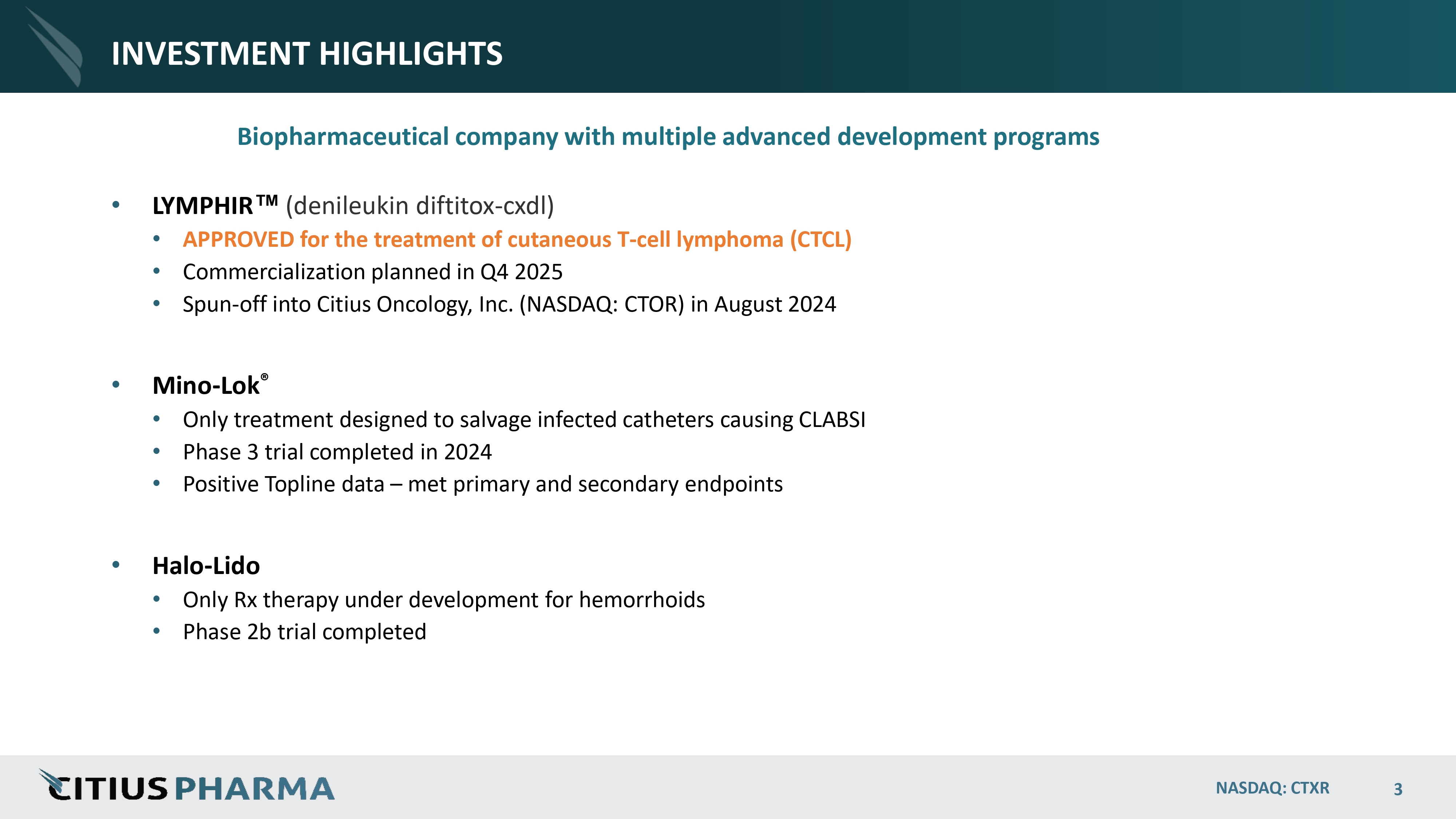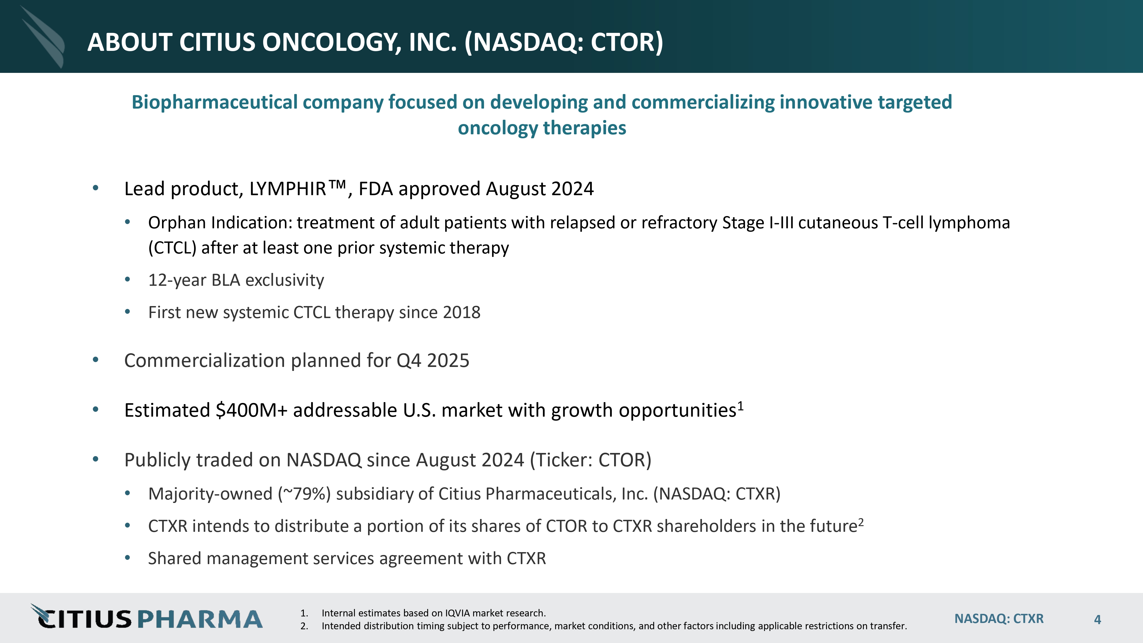 INVESTMENT HIGHLIGHTS Biopharmaceutical company with multiple advanced development programs • LYMPHIR (denileukin diftitox - cxdl) • APPROVED for the treatment of cutaneous T - cell lymphoma (CTCL) • Commercialization planned in Q4 2025 • Spun - off into Citius Oncology, Inc. (NASDAQ: CTOR) in August 2024 • Mino - Lok ® • Only treatment designed to salvage infected catheters causing CLABSI • Phase 3 trial completed in 2024 • Positive Topline data – met primary and secondary endpoints • Halo - Lido • Only Rx therapy under development for hemorrhoids • Phase 2b trial completed NASDAQ: CTXR 3