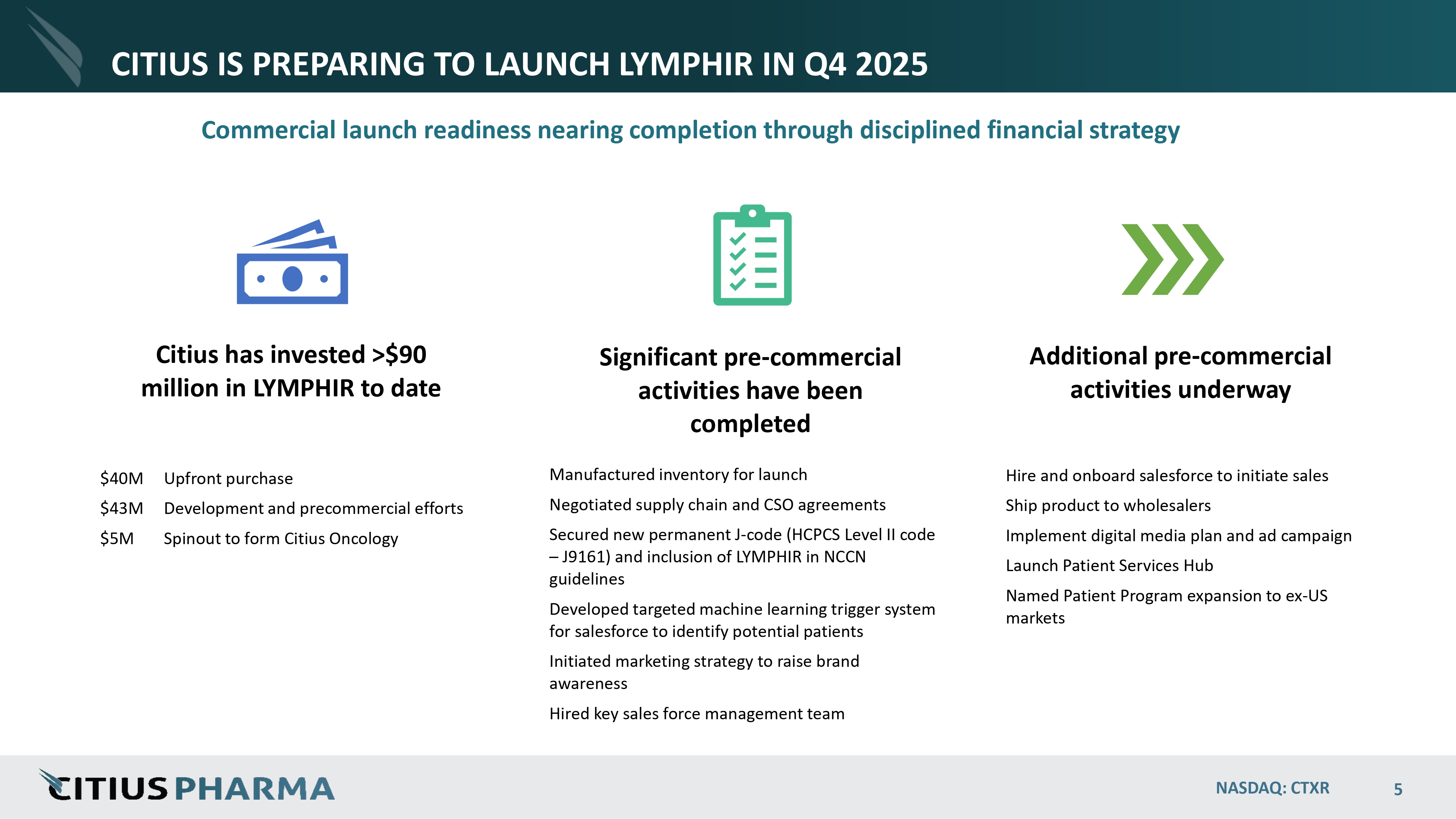 NASDAQ: CTXR ABOUT CITIUS ONCOLOGY, INC. (NASDAQ: CTOR) 4 1. Internal estimates based on IQVIA market research. 2. Intended distribution timing subject to performance, market conditions, and other factors including applicable restrictions on transfer. Biopharmaceutical company focused on developing and commercializing innovative targeted oncology therapies • Lead product, LYMPHIR , FDA approved August 2024 • Orphan Indication: treatment of adult patients with relapsed or refractory Stage I - III cutaneous T - cell lymphoma (CTCL) after at least one prior systemic therapy • 12 - year BLA exclusivity • First new systemic CTCL therapy since 2018 • Commercialization planned for Q4 2025 • Estimated $400M+ addressable U.S. market with growth opportunities 1 • Publicly traded on NASDAQ since August 2024 (Ticker: CTOR) • Majority - owned (~79%) subsidiary of Citius Pharmaceuticals, Inc. (NASDAQ: CTXR) • CTXR intends to distribute a portion of its shares of CTOR to CTXR shareholders in the future 2 • Shared management services agreement with CTXR