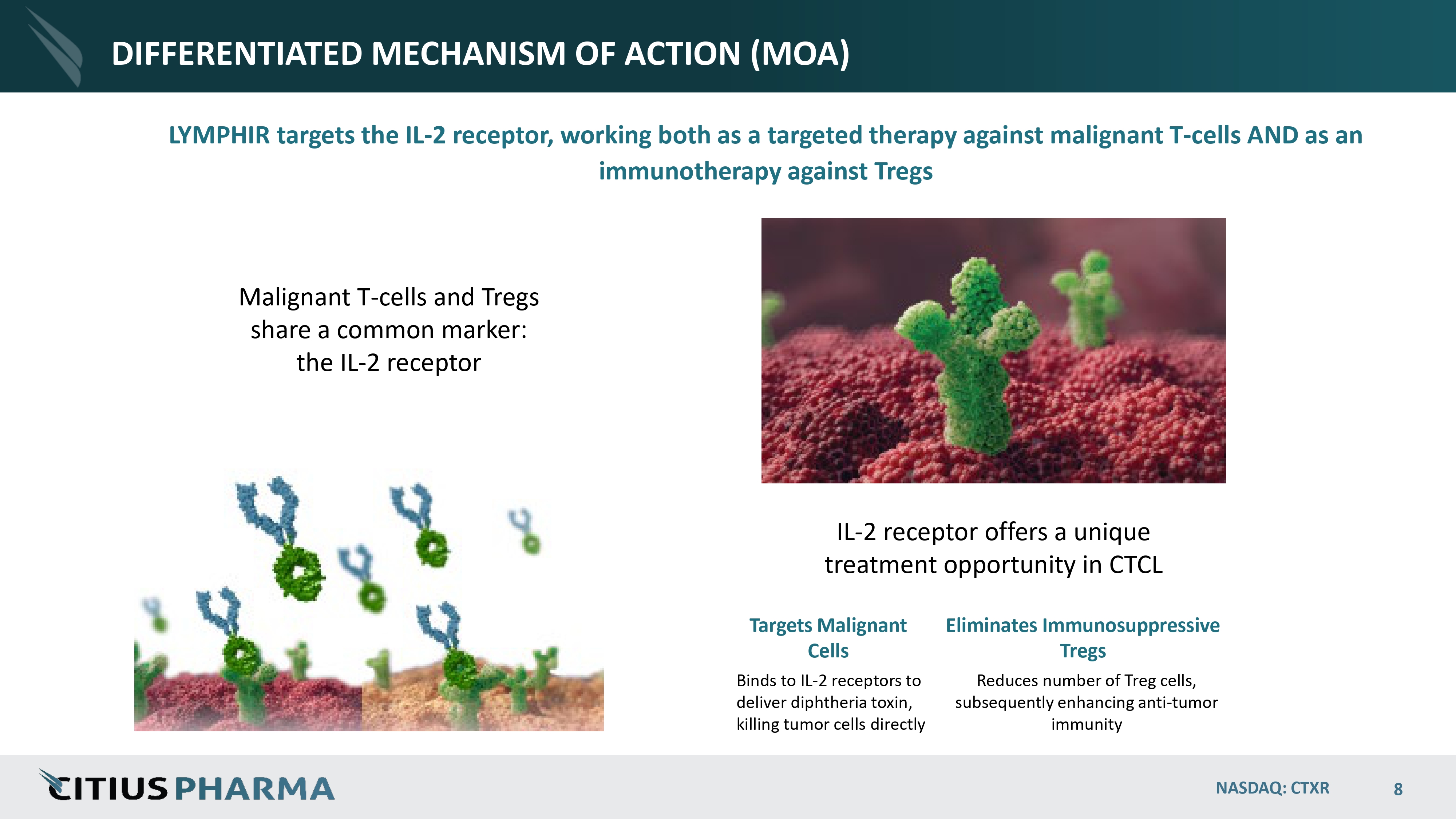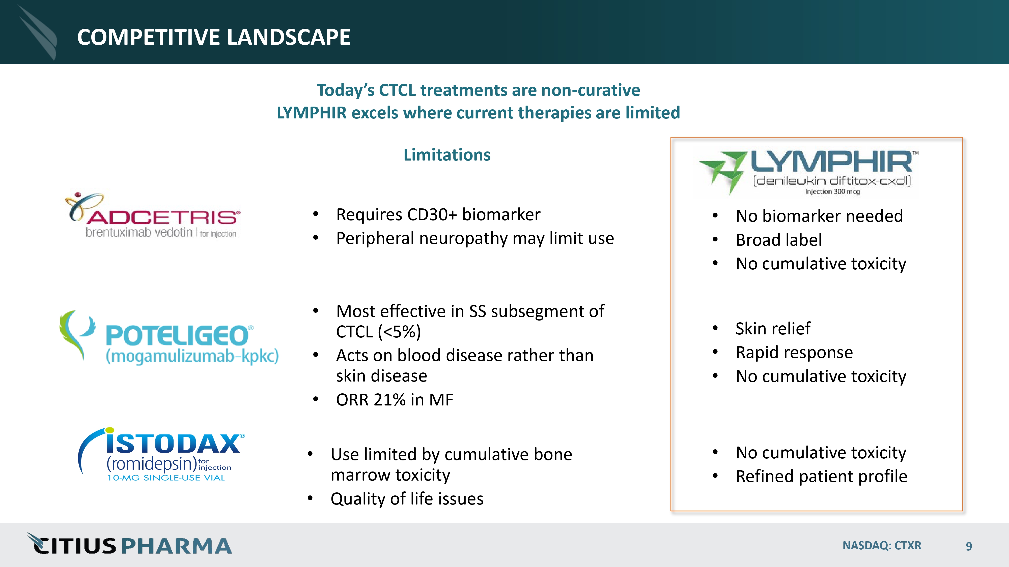 DIFFERENTIATED MECHANISM OF ACTION (MOA) LYMPHIR targets the IL - 2 receptor, working both as a targeted therapy against malignant T - cells AND as an immunotherapy against Tregs IL - 2 receptor offers a unique treatment opportunity in CTCL Malignant T - cells and Tregs share a common marker: the IL - 2 receptor Targets Malignant Cells Binds to IL - 2 receptors to deliver diphtheria toxin, killing tumor cells directly NASDAQ: CTXR 8 Eliminates Immunosuppressive Tregs Reduces number of Treg cells, subsequently enhancing anti - tumor immunity