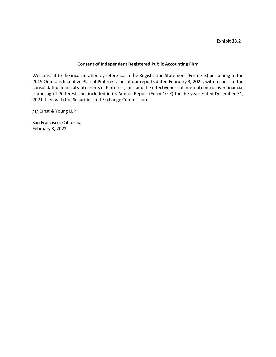 Exhibit 23.2 Consent of Independent Registered Public Accounting Firm We consent to the incorporation by reference in the Registration Statement (Form S-8) pertaining to the 2019 Omnibus Incentive Plan of Pinterest, Inc. of our reports dated February 3, 2022, with respect to the consolidated financial statements of Pinterest, Inc., and the effectiveness of internal control over financial reporting of Pinterest, Inc. included in its Annual Report (Form 10-K) for the year ended December 31, 2021, filed with the Securities and Exchange Commission. /s/ Ernst & Young LLP San Francisco, California February 3, 2022