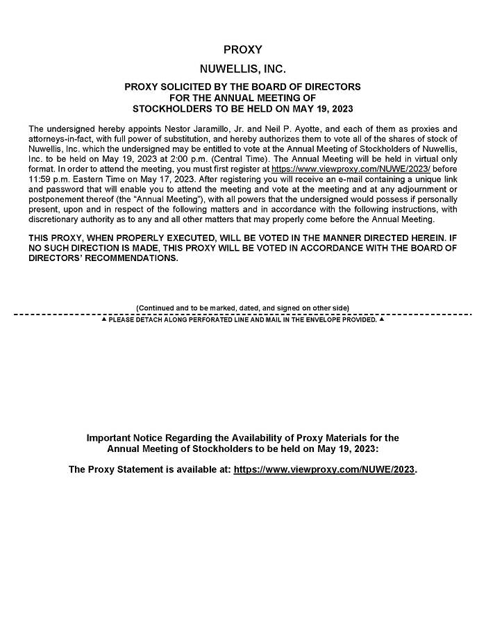 PROXY NUWELLIS, INC. PROXY SOLICITED BY THE BOARD OF DIRECTORS FOR THE ANNUAL MEETING OF STOCKHOLDERS TO BE HELD ON MAY 19, 2023 The undersigned hereby appoints Nestor Jaramillo, Jr. and Neil P. Ayotte, and each of them as proxies and attorneys-in-fact, with full power of substitution, and hereby authorizes them to vote all of the shares of stock of Nuwellis, Inc. which the undersigned may be entitled to vote at the Annual Meeting of Stockholders of Nuwellis, Inc. to be held on May 19, 2023 at 2:00 p.m. (Central Time). The Annual Meeting will be held in virtual only format. In order to attend the meeting, you must first register at https://www.viewproxy.com/NUWE/2023/ before 11:59 p.m. Eastern Time on May 17, 2023. After registering you will receive an e-mail containing a unique link and password that will enable you to attend the meeting and vote at the meeting and at any adjournment or postponement thereof (the “Annual Meeting”), with all powers that the undersigned would possess if personally present, upon and in respect of the following matters and in accordance with the following instructions, with discretionary authority as to any and all other matters that may properly come before the Annual Meeting. THIS PROXY, WHEN PROPERLY EXECUTED, WILL BE VOTED IN THE MANNER DIRECTED HEREIN. IF NO SUCH DIRECTION IS MADE, THIS PROXY WILL BE VOTED IN ACCORDANCE WITH THE BOARD OF DIRECTORS’ RECOMMENDATIONS. (Continued and to be marked, dated, and signed on other side) • PLEASE DETACH ALONG PERFORATED LINE AND MAIL IN THE ENVELOPE PROVIDED. • Important Notice Regarding the Availability of Proxy Materials for the Annual Meeting of Stockholders to be held on May 19, 2023: The Proxy Statement is available at: https://www.viewproxy.com/NUWE/2023.