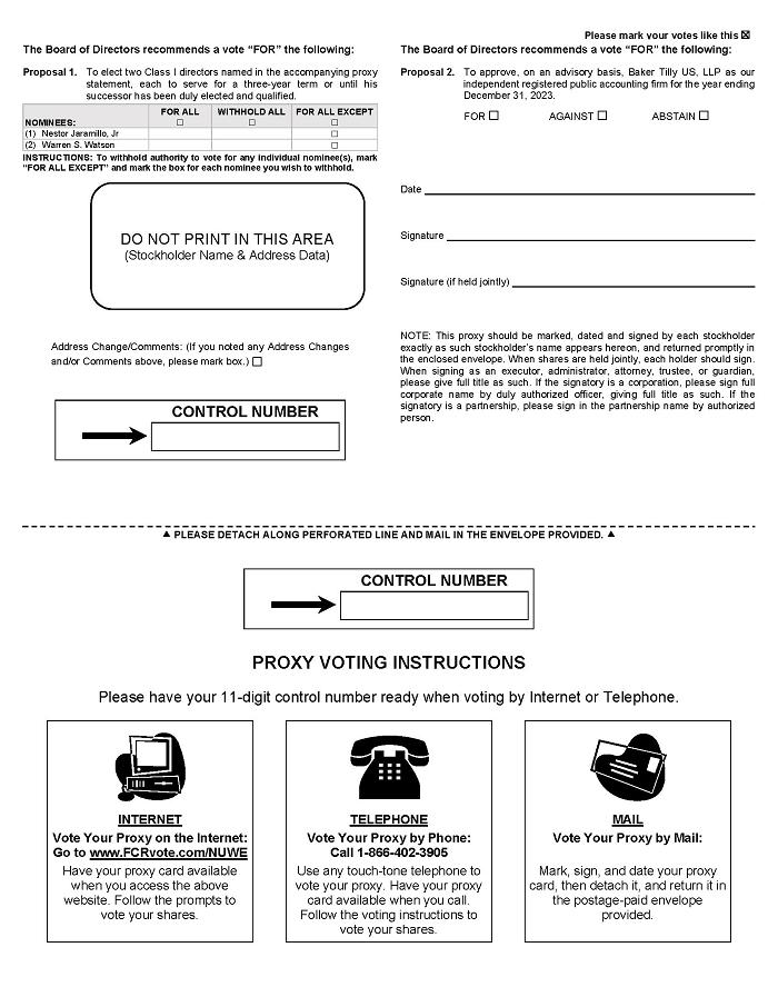 Please mark your votes like this . The Board of Directors recommends a vote “FOR” the following: The Board of Directors recommends a vote “FOR” the following: Proposal 1. To elect two Class I directors named in the accompanying proxy statement, each to serve for a three-year term or until his successor has been duly elected and qualified. NOMINEES: FOR ALL . WITHHOLD ALL . FOR ALL EXCEPT . (1) Nestor Jaramillo, Jr . (2) Warren S. Watson . INSTRUCTIONS: To withhold authority to vote for any individual nominee(s), mark“FOR ALL EXCEPT” and mark the box for each nominee you wish to withhold. DO NOT PRINT IN THIS AREA (Stockholder Name & Address Data) Address Change/Comments: (If you noted any Address Changes and/or Comments above, please mark box.) . CONTROL NUMBER Proposal 2. To approve, on an advisory basis, Baker Tilly US, LLP as our independent registered public accounting firm for the year ending December 31, 2023. FOR . AGAINST . ABSTAIN . Date Signature Signature (if held jointly) NOTE: This proxy should be marked, dated and signed by each stockholder exactly as such stockholder’s name appears hereon, and returned promptly in the enclosed envelope. When shares are held jointly, each holder should sign. When signing as an executor, administrator, attorney, trustee, or guardian, please give full title as such. If the signatory is a corporation, please sign full corporate name by duly authorized officer, giving full title as such. If the signatory is a partnership, please sign in the partnership name by authorized person. • PLEASE DETACH ALONG PERFORATED LINE AND MAIL IN THE ENVELOPE PROVIDED. • CONTROL NUMBER PROXY VOTING INSTRUCTIONS Please have your 11-digit control number ready when voting by Internet or Telephone. INTERNET Vote Your Proxy on the Internet: Go to www.FCRvote.com/NUWE Have your proxy card available when you access the above website. Follow the prompts to vote your shares. TELEPHONE Vote Your Proxy by Phone: Call 1-866-402-3905 Use any touch-tone telephone to vote your proxy. Have your proxy card available when you call. Follow the voting instructions to vote your shares. MAIL Vote Your Proxy by Mail: Mark, sign, and date your proxy card, then detach it, and return it in the postage-paid envelope provided.
