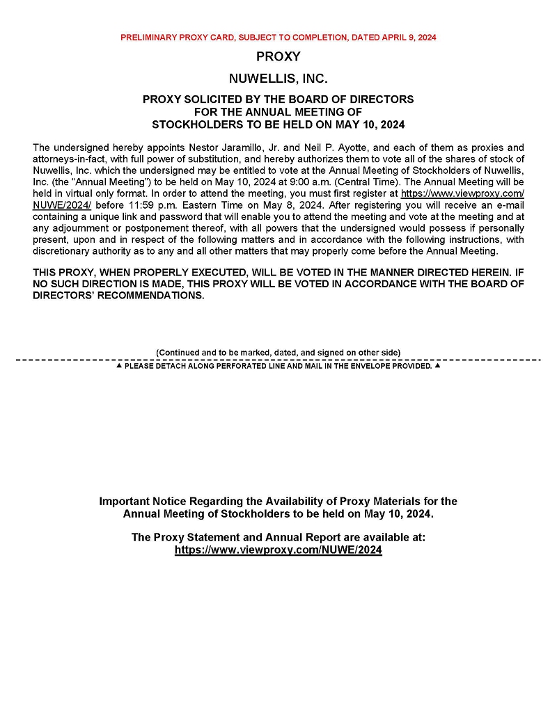 PRELIMINARY PROXY CARD, SUBJECT TO COMPLETION, DATED APRIL 9, 2024 PROXY NUWELLIS, INC. PROXY SOLICITED BY THE BOARD OF DIRECTORS FOR THE ANNUAL MEETING OF STOCKHOLDERS TO BE HELD ON MAY 10, 2024 The undersigned hereby appoints Nestor Jaramillo, Jr. and Neil P. Ayotte, and each of them as proxies and attorneys-in-fact, with full power of substitution, and hereby authorizes them to vote all of the shares of stock of Nuwellis, Inc. which the undersigned may be entitled to vote at the Annual Meeting of Stockholders of Nuwellis, Inc. (the “Annual Meeting”) to be held on May 10, 2024 at 9:00 a.m. (Central Time). The Annual Meeting will be held in virtual only format. In order to attend the meeting, you must first register at https://www.viewproxy.com/ NUWE/2024/ before 11:59 p.m. Eastern Time on May 8, 2024. After registering you will receive an e-mail containing a unique link and password that will enable you to attend the meeting and vote at the meeting and at any adjournment or postponement thereof, with all powers that the undersigned would possess if personally present, upon and in respect of the following matters and in accordance with the following instructions, with discretionary authority as to any and all other matters that may properly come before the Annual Meeting. THIS PROXY, WHEN PROPERLY EXECUTED, WILL BE VOTED IN THE MANNER DIRECTED HEREIN. IF NO SUCH DIRECTION IS MADE, THIS PROXY WILL BE VOTED IN ACCORDANCE WITH THE BOARD OF DIRECTORS’ RECOMMENDATIONS. (Continued and to be marked, dated, and signed on other side) . PLEASE DETACH ALONG PERFORATED LINE AND MAIL IN THE ENVELOPE PROVIDED. • Important Notice Regarding the Availability of Proxy Materials for the Annual Meeting of Stockholders to be held on May 10, 2024. The Proxy Statement and Annual Report are available at: https://www.viewproxy.com/NUWE/2024