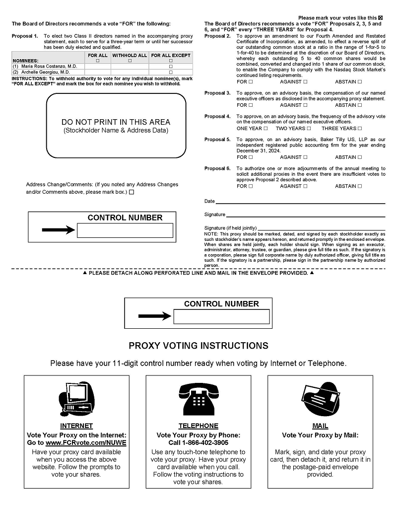 The Board of Directors recommends a vote “FOR” the following: Proposal 1. To elect two Class II directors named in the accompanying proxy statement, each to serve for a three-year term or until her successor has been duly elected and qualified. FOR ALL WITHHOLD ALL FOR ALL EXCEPT NOMINEES: . . . (1) Maria Rosa Costanzo, M.D. . (2) Archelle Georgiou, M.D. . INSTRUCTIONS: To withhold authority to vote for any individual nominee(s), mark “FOR ALL EXCEPT” and mark the box for each nominee you wish to withhold. DO NOT PRINT IN THIS AREA (Stockholder Name & Address Data) Address Change/Comments: (If you noted any Address Changes and/or Comments above, please mark box.) . CONTROL NUMBER Please mark your votes like this . The Board of Directors recommends a vote “FOR” Proposals 2, 3, 5 and 6, and “FOR” every “THREE YEARS” for Proposal 4. Proposal 2. To approve an amendment to our Fourth Amended and Restated Certificate of Incorporation, as amended, to effect a reverse split of our outstanding common stock at a ratio in the range of 1-for-5 to 1-for-40 to be determined at the discretion of our Board of Directors, whereby each outstanding 5 to 40 common shares would be combined, converted and changed into 1 share of our common stock, to enable the Company to comply with the Nasdaq Stock Market’s continued listing requirements. FOR . AGAINST . ABSTAIN . Proposal 3. To approve, on an advisory basis, the compensation of our named executive officers as disclosed in the accompanying proxy statement. FOR . AGAINST . ABSTAIN . Proposal 4. To approve, on an advisory basis, the frequency of the advisory vote on the compensation of our named executive officers. ONE YEAR . TWO YEARS . THREE YEARS . Proposal 5. To approve, on an advisory basis, Baker Tilly US, LLP as our independent registered public accounting firm for the year ending December 31, 2024. FOR . AGAINST . ABSTAIN . Proposal 6. To authorize one or more adjournments of the annual meeting to solicit additional proxies in the event there are insufficient votes to approve Proposal 2 described above. FOR . AGAINST . ABSTAIN . Date Signature Signature (if held jointly) NOTE: This proxy should be marked, dated, and signed by each stockholder exactly as such stockholder’s name appears hereon, and returned promptly in the enclosed envelope. When shares are held jointly, each holder should sign. When signing as an executor, administrator, attorney, trustee, or guardian, please give full title as such. If the signatory is a corporation, please sign full corporate name by duly authorized officer, giving full title as such. If the signatory is a partnership, please sign in the partnership name by authorized person. . PLEASE DETACH ALONG PERFORATED LINE AND MAIL IN THE ENVELOPE PROVIDED. • CONTROL NUMBER PROXY VOTING INSTRUCTIONS Please have your 11-digit control number ready when voting by Internet or Telephone. INTERNET Vote Your Proxy on the Internet: Go to www.FCRvote.com/NUWE Have your proxy card available when you access the above website. Follow the prompts to vote your shares. TELEPHONE Vote Your Proxy by Phone: Call 1-866-402-3905 Use any touch-tone telephone to vote your proxy. Have your proxy card available when you call. Follow the voting instructions to vote your shares. MAIL Vote Your Proxy by Mail: Mark, sign, and date your proxy card, then detach it, and return it in the postage-paid envelope provided.