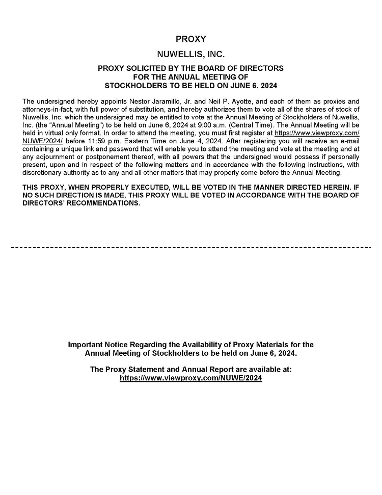 PROXY NUWELLIS, INC. PROXY SOLICITED BY THE BOARD OF DIRECTORS FOR THE ANNUAL MEETING OF STOCKHOLDERS TO BE HELD ON JUNE 6, 2024 The undersigned hereby appoints Nestor Jaramillo, Jr. and Neil P. Ayotte, and each of them as proxies and attorneys-in-fact, with full power of substitution, and hereby authorizes them to vote all of the shares of stock of Nuwellis, Inc. which the undersigned may be entitled to vote at the Annual Meeting of Stockholders of Nuwellis, Inc. (the "Annual Meeting") to be held on June 6, 2024 at 9:00 a.m. (Central Time). The Annual Meeting will be held in virtual only format. In order to attend the meeting, you must first register at https://www.viewproxy.com/ NUWE/2024/ before 11:59 p.m. Eastern Time on June 4, 2024. After registering you will receive an e-mail containing a unique link and password that will enable you to attend the meeting and vote at the meeting and at any adjournment or postponement thereof, with all powers that the undersigned would possess if personally present, upon and in respect of the following matters and in accordance with the following instructions, with discretionary authority as to any and all other matters that may properly come before the Annual Meeting. THIS PROXY, WHEN PROPERLY EXECUTED, WILL BE VOTED IN THE MANNER DIRECTED HEREIN. IF NO SUCH DIRECTION IS MADE, THIS PROXY WILL BE VOTED IN ACCORDANCE WITH THE BOARD OF DIRECTORS' RECOMMENDATIONS. Important Notice Regarding the Availability of Proxy Materials for the Annual Meeting of Stockholders to be held on June 6, 2024. The Proxy Statement and Annual Report are available at: https://www.viewproxy.com/NUWE/2024 The Board of Directors recommends a vote "FOR" the following: Proposal 1. To elect two Class II directors named in the accompanying proxy statement, each to serve for a three-year term or until her successor has been duly elected and qualified. FOR ALL WITHHOLD ALL FOR ALL EXCEPT NOMINEES: . . . (1) Maria Rosa Costanzo, M.D. . (2) Archelle Georgiou, M.D. . INSTRUCTIONS: To withhold authority to vote for any individual nominee(s), mark "FOR ALL EXCEPT" and mark the box for each nominee you wish to withhold. DO NOT PRINT IN THIS AREA (Stockholder Name Address Data) Date Signature Signature (if held jointly) Address Change/Comments: (If you noted any Address Changes and/or Comments above, please mark box.) . CONTROL NUMBER Please mark your votes like this . The Board of Directors recommends a vote "FOR" Proposals 2, 3, 5, 6 and 7, and "FOR" every "THREE YEARS" for Proposal 4. Proposal 2. Proposal 3. Proposal 4. Proposal 5. Proposal 6. Proposal 7. To approve an amendment to our Fourth Amended and Restated Certificate of Incorporation, as amended, to effect a reverse split of our outstanding common stock at a ratio in the range of 1-for-5 to 1-for-70 to be determined at the discretion of our Board of Directors, whereby each outstanding 5 to 70 common shares would be combined, converted and changed into 1 share of our common stock, to enable the Company to comply with the Nasdaq Stock Market's continued listing requirements. FOR . AGAINST . ABSTAIN . To approve, on an advisory basis, the compensation of our named executive officers as disclosed in the accompanying proxy statement. FOR . AGAINST . ABSTAIN . To approve, on an advisory basis, the frequency of the advisory vote on the compensation of our named executive officers. ONE YEAR . TWO YEARS . THREE YEARS . To approve, on an advisory basis, Baker Tilly US, LLP as our independent registered public accounting firm for the year ending December 31, 2024. FOR . AGAINST . ABSTAIN . To approve, for the purpose of complying with the applicable provisions of The Nasdaq Stock Market LLC ("Nasdaq"), the anti-dilution provisions set forth in our common warrants issued to institutional investors in connection with our offering that closed on April 29, 2024. FOR . AGAINST . ABSTAIN . To authorize one or more adjournments of the annual meeting to solicit additional proxies in the event there are insufficient votes to approve Proposal 2 described above. FOR . AGAINST . ABSTAIN . NOTE: This proxy should be marked, dated, and signed by each stockholder exactly as such stockholder's name appears hereon, and returned promptly in the enclosed envelope. When shares are held jointly, each holder should sign. When signing as an executor, administrator, attorney, trustee, or guardian, please give full title as such. If the signatory is a corporation, please sign full corporate name by duly authorized officer, giving full title as such. If the signatory is a partnership, please sign in the partnership name by authorized person. . PLEASE DETACH ALONG PERFORATED LINE AND MAIL IN THE ENVELOPE PROVIDED. o CONTROL NUMBER PROXY VOTING INSTRUCTIONS Please have your 11-digit control number ready when voting by Internet or Telephone. INTERNET Vote Your Proxy on the Internet: Go to www.FCRvote.com/NUWE Have your proxy card available when you access the above website. Follow the prompts to vote your shares. TELEPHONE Vote Your Proxy by Phone: Call 1-866-402-3905 Use any touch-tone telephone to vote your proxy. Have your proxy card available when you call. Follow the voting instructions to vote your shares. MAIL Vote Your Proxy by Mail: Mark, sign, and date your proxy card, then detach it, and return it in the postage-paid envelope provided.