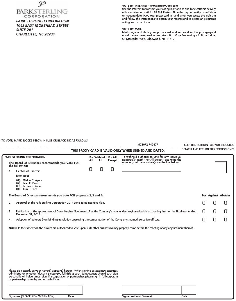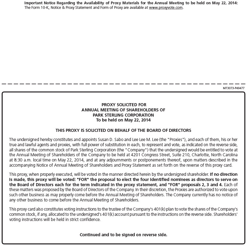 We are pleased to invite you to attend the 2014 Annual Meeting of Shareholders of Park Sterling Corporation. The Annual Meeting will be held at 4201 Congress Street, Suite 210, Charlotte, North Carolina, on Thursday, May 22, 2014 at 8:30 A.M., local time.