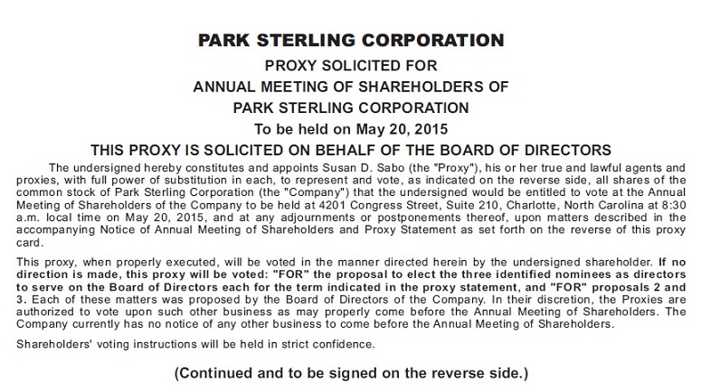 This Proxy Statement is furnished in connection with the solicitation by the Board of Directors of Park Sterling Corporation (the “Company”) of proxies to be used at the 2015 Annual Meeting of Shareholders of the Company (the “Annual Meeting”) to be held on Wednesday, May 20, 2015, at 8:30 A.M., local time, at 4201 Congress Street, Suite 210, Charlotte, North Carolina, and at any adjournment or adjournments thereof. These proxy materials are first being mailed or made available to shareholders on or about April 13, 2015.