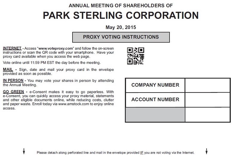 We are pleased to invite you to attend the 2015 Annual Meeting of Shareholders of Park Sterling Corporation. The Annual Meeting will be held at 4201 Congress Street, Suite 210, Charlotte, North Carolina, on Wednesday, May 20, 2015 at 8:30 A.M., local time.