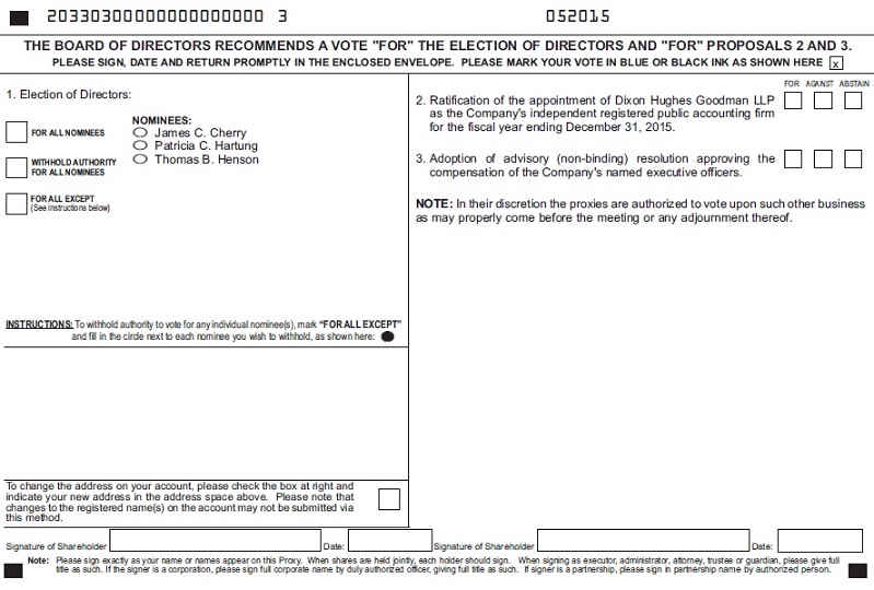 “Routine” and “Non-routine” Matters. The ratification of the appointment of Dixon Hughes Goodman LLP as the Company’s independent registered public accounting firm for 2015 (Proposal 2) is considered a routine matter under applicable stock exchange rules. Therefore, even if your broker does not receive voting instructions from you, your broker is entitled (but not required) to vote your shares on this proposal. The election of directors (Proposal 1) and the advisory “say on pay” vote (Proposal 3) are considered non-routine matters under applicable stock exchange rules, and your broker is not entitled to vote your shares on these proposals without your instructions.