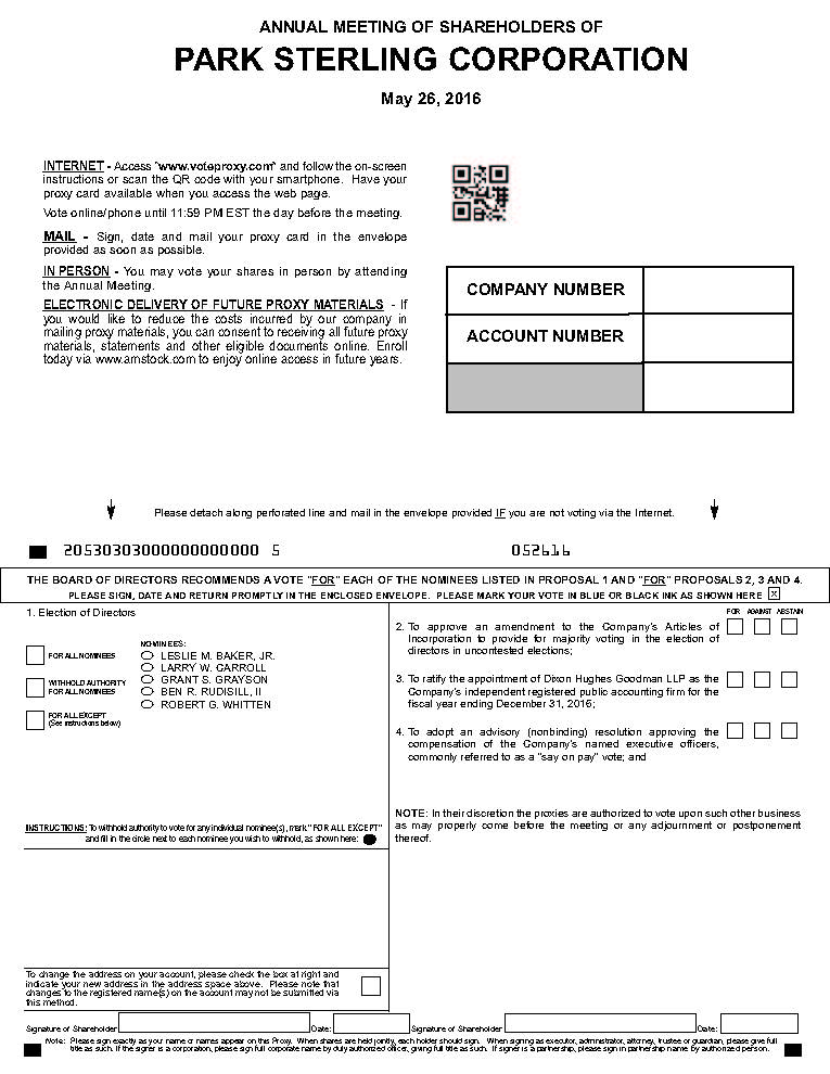 We are pleased to invite you to attend the 2016 Annual Meeting of Shareholders of Park Sterling Corporation. The Annual Meeting will be held at 4201 Congress Street, Suite 210, Charlotte, North Carolina, on Thursday, May 26, 2016 at 8:30 A.M., local time.