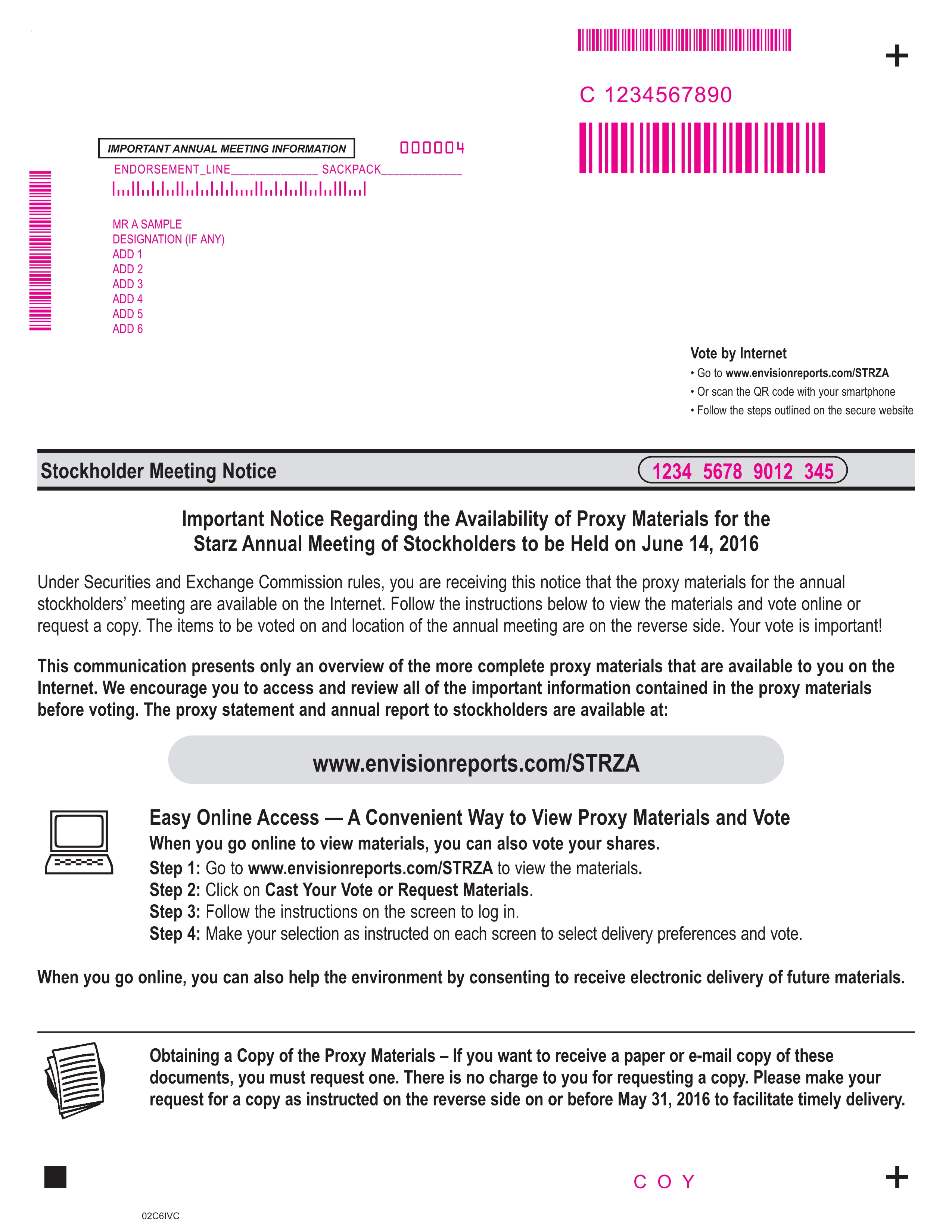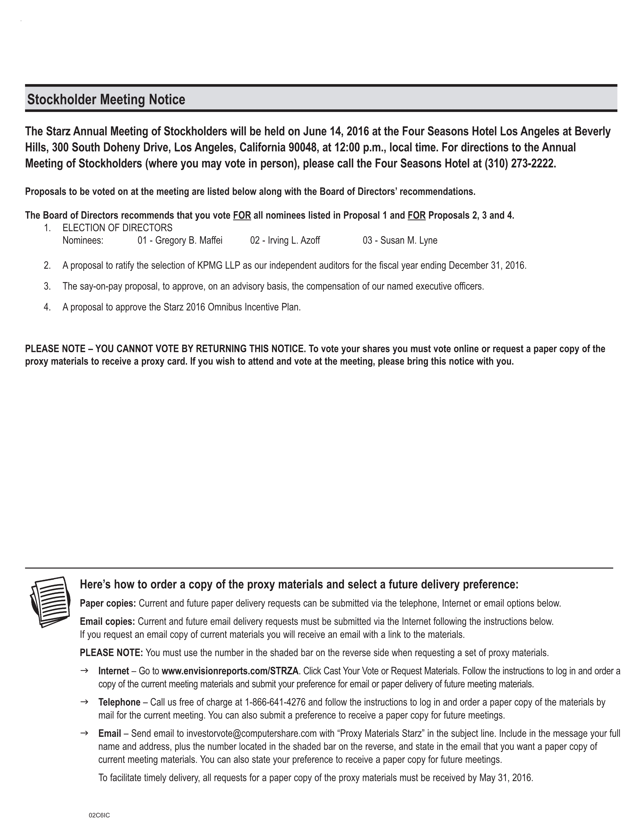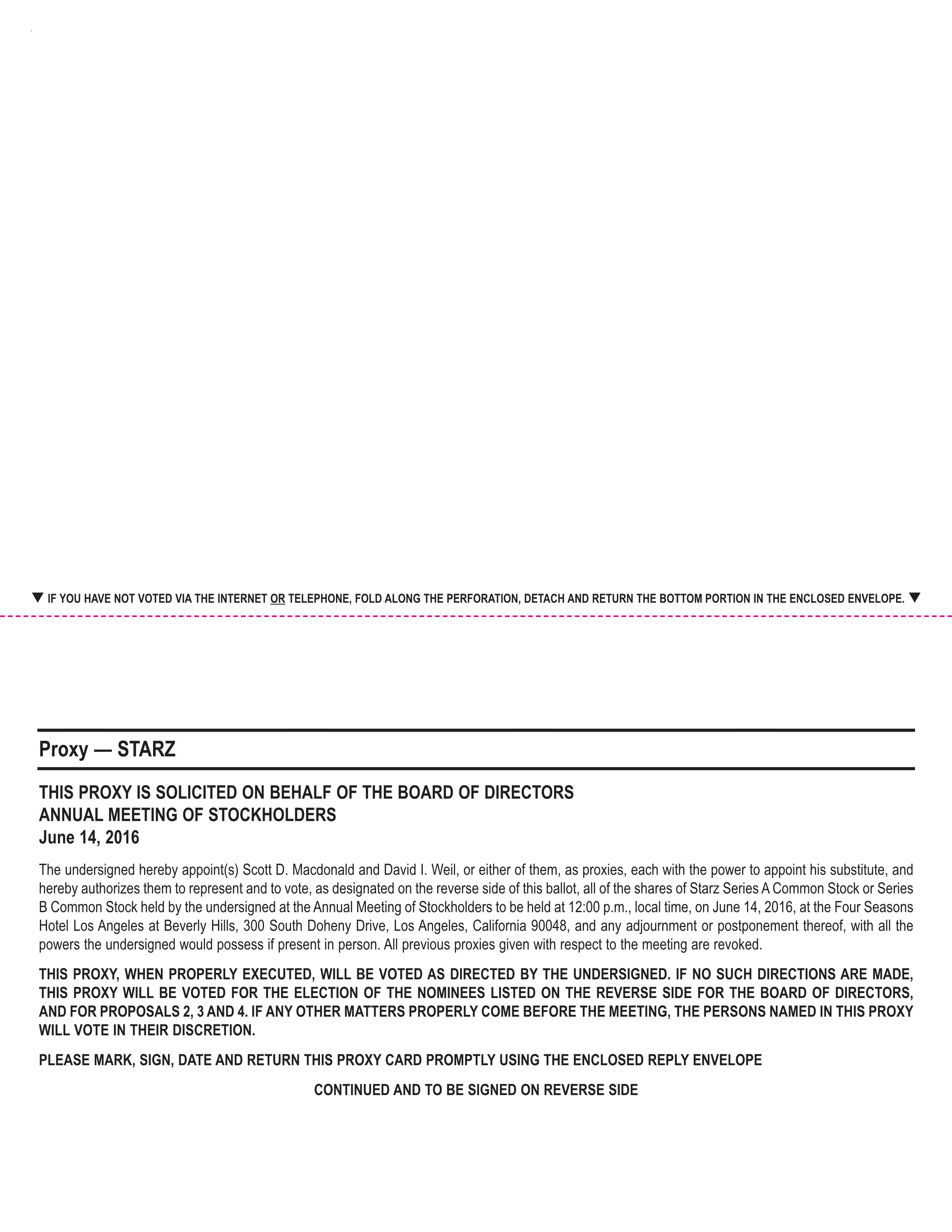NOTICE IS HEREBY GIVEN of the annual meeting of stockholders of Starz to be held at 12:00 p.m., local time, on June 14, 2016, at the Four Seasons Hotel Los Angeles at Beverly Hills, 300 South Doheny Drive, Los Angeles, California 90048, telephone (310) 273-2222, to consider and vote on: